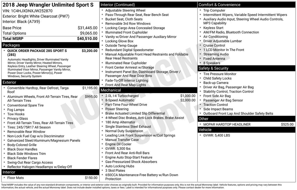 Bright White Clearcoat 2018 Jeep Wrangler Unlimited Sport S 4WD 8-Speed Automatic 2.0L I4 DOHC Automatic Headlamps, Deep Tint Sunscreen Windows, Front 1-Touch Down Power Windows, Leather Wrapped Steering Wheel, ParkView Rear Back-Up Camera, Power Heated Mirrors, Quick Order Package 28S Sport S, Remote Keyless Entry, Security Alarm, Speed Sensitive Power Locks, Sun Visors w/Illuminated Vanity Mirrors, Wheels: 17" x 7.5" Tech Silver Aluminum.Recent Arrival!Awards: * 2018 KBB.com 10 Most Awarded Brands