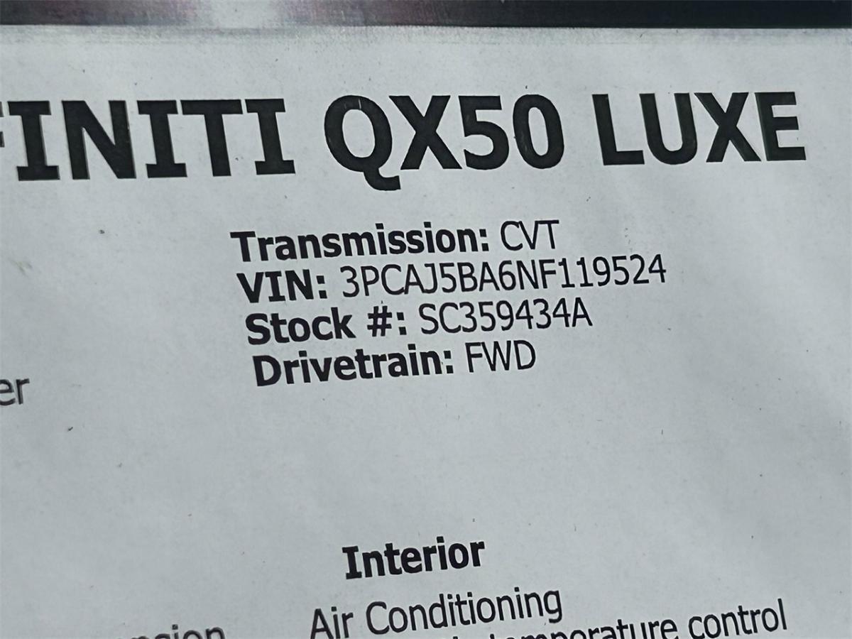 <p>Experience the Road in Style and Comfort with the 2022 INFINITI QX50 LUXE - A Perfect Blend of Performance and Luxury</p><p>Step into the 2022 INFINITI QX50 LUXE, where sophistication meets dynamic performance. Designed for the discerning driver, this Graphite Shadow beauty offers a driving experience that is both exhilarating and refined. With its 4-cylinder engine and CVT transmission, the QX50 ensures a smooth and responsive ride, perfect for navigating city streets or embarking on long journeys. The front-wheel-drive system enhances handling, making every drive feel seamless and controlled.</p><p>Inside, the QX50 LUXE is a sanctuary of luxury. The cabin is crafted with premium materials, offering a serene environment that cocoons you in comfort. Advanced safety features provide peace of mind, while cutting-edge technology keeps you connected and entertained on the go. The intuitive infotainment system integrates seamlessly with your lifestyle, offering navigation and connectivity at your fingertips.</p><p>The exterior design is a testament to INFINITI&apos;s commitment to elegance and innovation, with sleek lines and a commanding presence that turns heads wherever you go. Whether you&apos;re commuting or exploring new horizons, the 2022 INFINITI QX50 LUXE is your ideal companion, delivering an unparalleled driving experience that is both luxurious and practical.</p><p>Be sure to call or visit Cerritos Nissan to discover more. Your new favorite vehicle awaits - don't let someone else drive it home!</p>&zwnj;