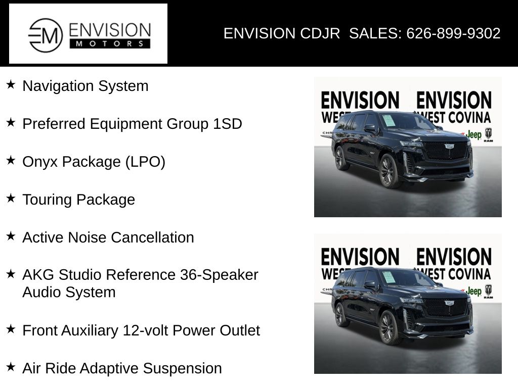 WE SPECIALIZE IN ALL CREDIT PROFILES! See what we can do for you! Call to find out (626) 899-9302.Odometer is 6534 miles below market average! AWD, Active Noise Cancellation, Adaptive Cruise Control, Air Ride Adaptive Suspension, AKG Studio Reference 36-Speaker Audio System, Automatic Seat Belt Tightening, Body-Color Door Handles, Door Lock & Latch Shields, Electronic Limited-Slip Differential, Enhanced Automatic Emergency Braking, Enhanced Automatic Parking Assist, Floor Console w/Covered Storage, Front Auxiliary 12-volt Power Outlet, Glass Breakage Sensor, Gloss Black Escalade Nameplate (LPO), Heated & Ventilated Driver & Front Passenger Seats, Hitch Guidance w/Hitch View, Illuminating Front & Rear Sill Plates, Integrated Trailer Brake Controller, Monochrome Cadillac Emblems (LPO), Navigation System, Onyx Package (LPO), Platinum Interior Trim, Power Lumbar Massage Driver Seat, Power Lumbar Massage Front Passenger Seat, Power moonroof, Power Panoramic Tilt-Sliding Sunroof, Power-Retractable Assist Steps, Preferred Equipment Group 1SD, Rear Camera Mirror, Rear Camera Mirror Washer, Rear Cross Traffic Alert, Rear Seat Entertainment System, Reconfigurable Full-Color Head-Up Display, Reverse Automatic Braking, Smart Trailer Integration Indicator, Soft Closing Front & Rear Doors, Theft-Deterrent Alarm System, Touring Package, Trailer Side Blind Zone Alert, Vehicle Inclination Sensor, Vehicle Interior Movement Sensor, Wheels: 22" Forged Multi-Spoke Alloy (LPO), Wheels: 22" Interim (LPO).Black Raven2023 Cadillac Escalade ESV V-Series AWD 10-Speed Automatic with Overdrive 6.2L V8 Supercharged**********All Pricing and Advertised Prices for any/all vehicles offered for sale does not include dealer installed accessories which can be purchased for an additional cost.********** The Factory Rebates may not be available on this vehicle if you elect to take advantage of a Special Alternative APR or Special Lease program. Some Factory Rebates are California Resident specific and may vary for residents of other states. NO sales to Dealers, Brokers or Exporters. For out of state purchase, customers must be present to purchase. If shipping is required, dealership must facilitate; no exceptions. Please contact us for special Multi-Vehicle or Fleet pricing. Prices are plus government fees and taxes, any finance charges, $85 documentary fee, $29 electronic registration fee, any emission testing charge and $1.75 per new tire state tire fee. *** We make every effort to provide accurate information, but please verify before purchasing. Leasing & financing available on approved credit. Trade-ins accepted. Subject to prior sale.