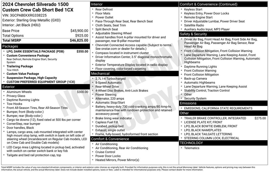 Sterling Gray Metallic 2024 Chevrolet Silverado 1500 Custom RWD 8-Speed Automatic 2.7L I4 Turbocharged DOHC 16V LEV3-SULEV30 310hp 8-Speed Automatic, Black Cloth, 10-Way Power Driver Seat w/Lumbar, 120-Volt Bed Mounted Power Outlet, 120-Volt Interior Power Outlet, 3.5" Monochromatic Display Driver Info Center, Black Name Plates (LPO), Bluetooth® For Phone, Chevrolet Connected Access Capable, Color-Keyed Carpeting Floor Covering, Custom Convenience Package, Custom Value Package, Dark Essentials Package (LPO), Deep-Tinted Glass, Dual Rear USB Ports (Charge Only), Electric Rear-Window Defogger, Electrical Steering Column Lock, Electronic Cruise Control, EZ Lift Power Lock & Release Tailgate, Front Frame-Mounted Black Recovery Hooks, Front Rubberized Vinyl Floor Mats, HD Rear Vision Camera, High Capacity Suspension Package, Hitch Guidance, LED Cargo Area Lighting, Manual Tilt Wheel Steering Column, OnStar & Chevrolet Connected Services Capable, Power Front Windows w/Driver Express Up/Down, Power Front Windows w/Passenger Express Down, Power Rear Windows w/Express Down, Preferred Equipment Group 1CX, Rear 60/40 Folding Bench Seat (Folds Up), Rear Rubberized-Vinyl Floor Mats, Remote Keyless Entry, Remote Vehicle Starter System, SiriusXM Radio, Standard Tailgate, Theft Deterrent System (Unauthorized Entry), Trailering Package, Wi-Fi Hot Spot Capable.