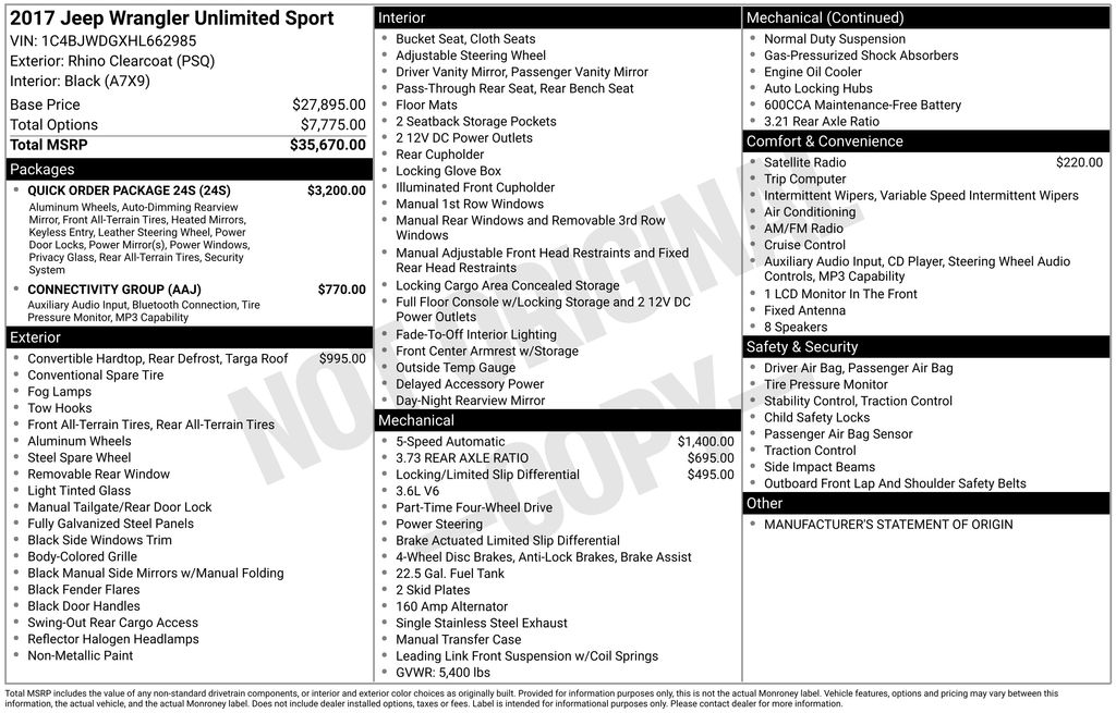 Rhino Clearcoat 2017 Jeep Wrangler Unlimited Sport 4WD 5-Speed Automatic 3.6L V6 24V VVTOdometer is 998 miles below market average!Awards: * 2017 KBB.com 10 Most Awarded Brands