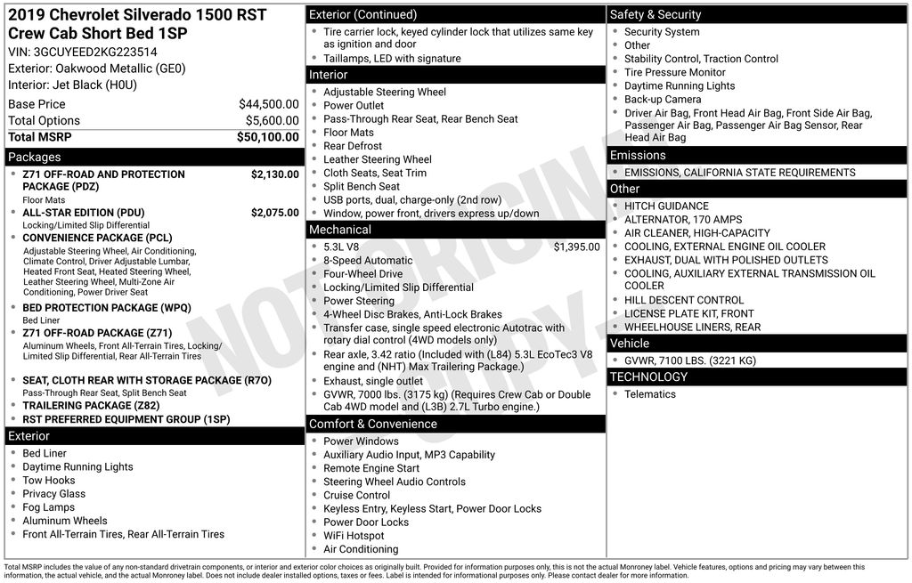 Oakwood Metallc 2019 Chevrolet Silverado 1500 RST 4WD 8-Speed Automatic EcoTec3 5.3L V8 8-Speed Automatic, 4WD, Black Cloth, 10-Way Power Driver Seat w/Lumbar, All-Star Edition, All-Weather Floor Liner (LPO) (AAK), Bed Protection Package, Chevytec Spray-On Black Bedliner, Cloth Rear Seat w/Storage Package, Convenience Package, Dual Exhaust w/Polished Outlets, Dual-Zone Automatic Climate Control, Heated Driver & Front Passenger Seats, Heated Steering Wheel, Heavy-Duty Rear Locking Differential, High Capacity Air Filter, Hill Descent Control, Hitch Guidance, Leather Wrapped Steering Wheel, Manual Tilt/Telescoping Steering Column, Off-Road Suspension, Rear Wheelhouse Liners, Trailering Package, Z71 Off-Road & Protection Package, Z71 Off-Road Package.