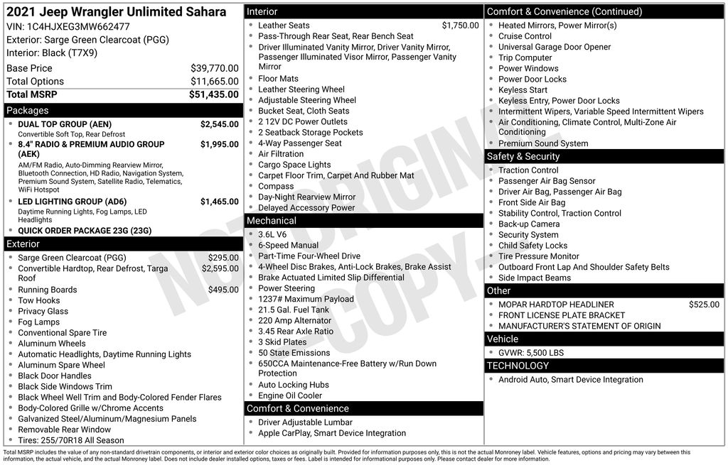 Sarge Green Clearcoat 2021 Jeep Wrangler Unlimited Sahara 4WD 6-Speed Manual 3.6L V6 24V VVT 1-Year SiriusXM Guardian Trial, 4G LTE Wi-Fi Hot Spot, 5-Year SiriusXM Traffic Service, 5-Year SiriusXM Travel Link Service, 8.4" Radio & Premium Audio Group, 8.4" Touchscreen Display, Alpine Premium Audio System, Auto-Dimming Rear-View Mirror, Body Color 3-Piece Hard Top, Daytime Running Lamps LED Accents, Dual Top Group, Emergency/Assistance Call, For Details, Visit DriveUconnect.com, Freedom Panel Storage Bag, Front LED Fog Lamps, GPS Navigation, HD Radio, Leather steering wheel, LED Lighting Group, LED Premium Reflector Headlamps, LED Taillamps, MOPAR Black Perforated Leather, ParkView Rear Back-Up Camera, Premium Black Sunrider Soft Top w/Dual Top Group, Quick Order Package 23G, Radio: Uconnect 4C Nav w/8.4" Display, Rear Window Defroster, Rear Window Wiper/Washer, SiriusXM Traffic Plus, SiriusXM Travel Link, Stop-Start Dual Battery System.