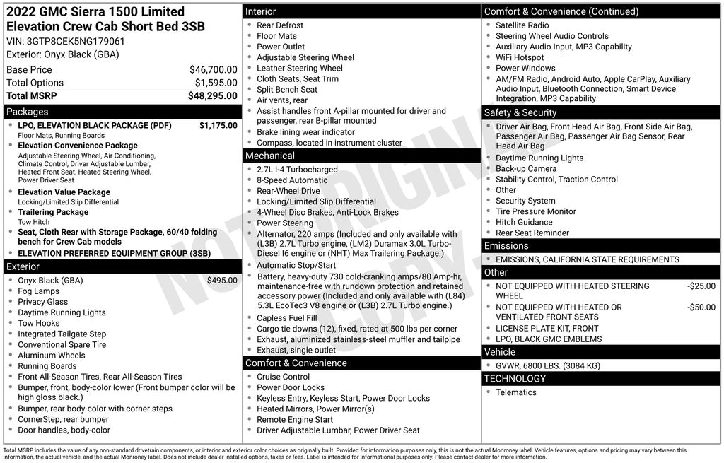 Onyx Black 2022 GMC Sierra 1500 Limited Elevation RWD 8-Speed Automatic 2.7L Turbo 12-Volt Rear Auxiliary Power Outlet, 6" Rectangular Black Tubular Assist Steps (LPO), All-Weather Floor Liner (LPO), Auto-Locking Rear Differential, Black GMC Emblems (LPO), Body-Color Surround Grille, Cloth Rear Seat w/Storage Package, Color-Keyed Carpeting Floor Covering, Compass, Deep-Tinted Glass, Dual-Zone Automatic Climate Control, Electric Rear-Window Defogger, Elevation Black Package (LPO), Elevation Convenience Package, Elevation Value Package, Front Frame-Mounted Black Recovery Hooks, Front Rubberized-Vinyl Floor Mats, GMC Connected Access Capable, Heated Driver & Front Outboard Passenger Seating, Heated Steering Wheel, Hitch Guidance, Keyless Open & Start, LED Cargo Area Lighting, Manual Tilt-Wheel & Telescoping Steering Column, OnStar & GMC Connected Services Capable, Power Door Locks, Power Front Windows w/Driver Express Up/Down, Power Front Windows w/Passenger Express Down, Power Rear Windows w/Express Down, Preferred Equipment Group 3SB, Rear Dual USB Charging-Only Ports, Rear Rubberized-Vinyl Floor Mats, Rear Wheelhouse Liners, Remote Vehicle Starter System, Steering Wheel Audio Controls, Theft Deterrent System (Unauthorized Entry), Trailering Package, Wi-Fi Hotspot Capable.