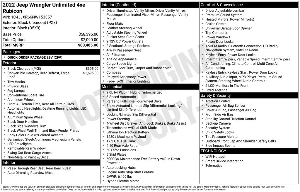 Black Clearcoat 2022 Jeep Wrangler Unlimited Rubicon 4xe 4WD 8-Speed Automatic 2.0L I4 DOHC 2.0L I4 DOHC, Apple CarPlay/Android Auto, Black 3-Piece Hard Top, Freedom Panel Storage Bag, Navigation System, No Soft Top, ParkView Rear Back-Up Camera, Quick Order Package 29V, Radio: Uconnect 4C Nav w/8.4" Display, Rear Window Defroster, Rear Window Wiper/Washer, Remote keyless entry, Wheels: 17" x 7.5" Machined/Painted Black.20/49 City/Highway MPG
