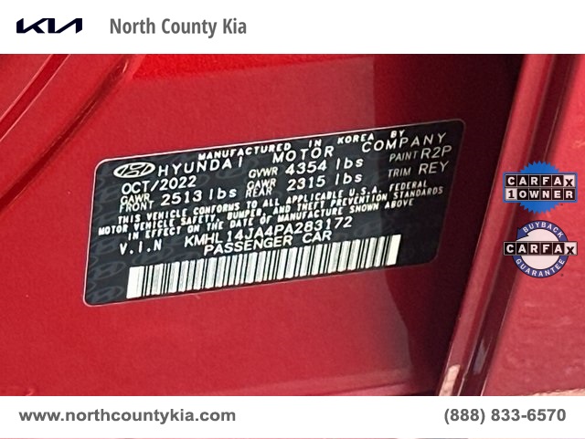 At North County Kia, our people make the difference! We take pride in our vehicles and do everything we can to make your buying experience top notch and you will not find better deals on nicer cars anywhere! We look forward to exceeding your expectations!.Dark Gray Cloth, 12.3" LCD Instrument Cluster, 2nd Row Air Vent, 2nd Row USB Charge Port, Auto-Dimming Rear-View Mirror, Convenience Package, Hyundai Digital Key, Leather-Wrapped Steering Wheel, LED Interior Lights, Navigation System, Option Group 02, Panoramic Sunroof, Wireless Device Charging.CARFAX One-Owner. Clean CARFAX. Our People Make the Difference. We take pride in our vehicles and do everything we can to make your buying experience top notch and you will not find better deals on nicer cars anywhere! We look forward to exceeding your expectations!.Odometer is 13968 miles below market average! 27/37 City/Highway MPG