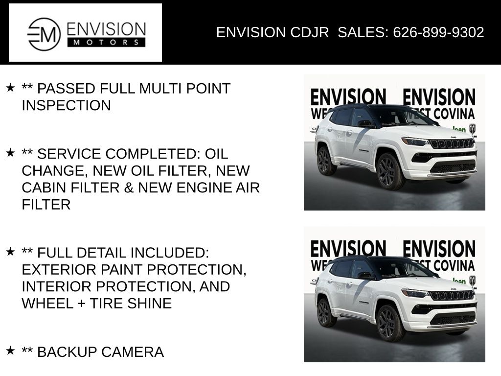 24/32 City/Highway MPG ** PASSED FULL MULTI POINT INSPECTION, ** SERVICE COMPLETED: OIL CHANGE, NEW OIL FILTER, NEW CABIN FILTER & NEW ENGINE AIR FILTER, ** FULL DETAIL INCLUDED: EXTERIOR PAINT PROTECTION, INTERIOR PROTECTION, AND WHEEL + TIRE SHINE, ** BACKUP CAMERA, ** BLUETOOTH, ** APPLE CAR PLAY/ ANDROID AUTO, 4WD, 10.1" Touchscreen Display, 2nd Row USB Type A/C Charge Only, Alexa Built-In, Black Day Light Opening Moldings, Body Color Door Claddings, Body Color Exterior Sill Moldings, Body Color Fascias, Body Color Wheel Flares, Cluster 10.25" TFT Color Display, Connected Travel & Traffic Services, Driver Seat Memory, Elite Interior Group High Altitude, Foot Activated Open 'N Go Liftgate, Gloss Black Surround/Neutral Gray Rings, GPS Navigation, HD Radio, High Altitude Package, Integrated Voice Command w/Bluetooth, LED Low/Highbeam Projector Headlamps, Liquid Chrome/Chainmail Hydro Accent, Neutral Gray Exterior Accents, Neutral Gray Exterior Badging, Power 2-Way Passenger Lumbar Adjust, Power 8-Way Adjust Front Passenger Seat, Power Front/Fixed Rear Full Sunroof, Power Liftgate, Premium Alpine Speaker System, Premium Leather Trimmed Bucket Seats, Premium LED Fog Lamps, Premium Taillamps, Quick Order Package 29G, Reversible Carpet/Vinyl Cargo Mat, SiriusXM w/360L, Ventilated Front Seats, Wheels: 19" x 7.5" Aluminum Painted.Bright White Clearcoat2025 Jeep Compass Limited 4WD 8-Speed Automatic 2.0L I4 DOHC Price includes: $1500 - 2025 National Retail Bonus Cash . Exp. 09/02/2025 $1500 - 2025 National SFS Lease Loyalty Bonus Cash. Exp. 09/02/2025 $500 - 2025 National 2025 Military Bonus Cash. Exp. 01/05/2026