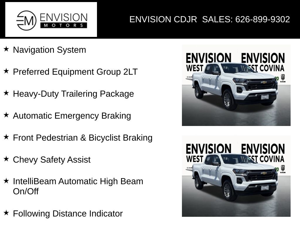 WE SPECIALIZE IN ALL CREDIT PROFILES! See what we can do for you! Call to find out (626) 899-9302.Odometer is 10292 miles below market average! Automatic Emergency Braking, Chevy Safety Assist, Following Distance Indicator, Forward Collision Alert, Front Pedestrian & Bicyclist Braking, Heavy-Duty Trailering Package, Integrated Trailer Brake Controller, IntelliBeam Automatic High Beam On/Off, Lane Keep Assist w/Lane Departure Warning, Navigation System, Preferred Equipment Group 2LT.Summit White2024 Chevrolet Colorado LT RWD 8-Speed Automatic 2.7L I4 Turbocharged DOHC 16V LEV3-ULEV50 237hp**********All Pricing and Advertised Prices for any/all vehicles offered for sale does not include dealer installed accessories which can be purchased for an additional cost.********** The Factory Rebates may not be available on this vehicle if you elect to take advantage of a Special Alternative APR or Special Lease program. Some Factory Rebates are California Resident specific and may vary for residents of other states. NO sales to Dealers, Brokers or Exporters. For out of state purchase, customers must be present to purchase. If shipping is required, dealership must facilitate; no exceptions. Please contact us for special Multi-Vehicle or Fleet pricing. Prices are plus government fees and taxes, any finance charges, $85 documentary fee, $29 electronic registration fee, any emission testing charge and $1.75 per new tire state tire fee. *** We make every effort to provide accurate information, but please verify before purchasing. Leasing & financing available on approved credit. Trade-ins accepted. Subject to prior sale.Awards: * Motor Trend Truck of the Year