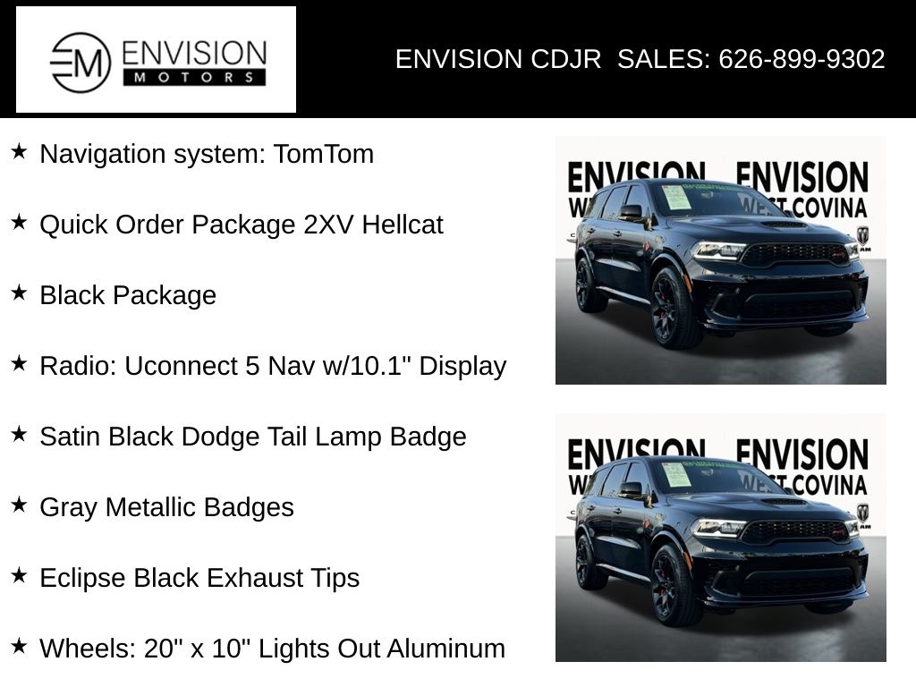 WE SPECIALIZE IN ALL CREDIT PROFILES! See what we can do for you! Call to find out (626) 899-9302.Recent Arrival! CARFAX One-Owner. Clean CARFAX.Odometer is 2125 miles below market average! AWD, Black Package, Eclipse Black Exhaust Tips, Gray Metallic Badges, Navigation system: TomTom, Quick Order Package 2XV Hellcat, Radio: Uconnect 5 Nav w/10.1" Display, Satin Black Dodge Tail Lamp Badge, Wheels: 20" x 10" Lights Out Aluminum.DB Black Crystal Clearcoat2024 Dodge Durango SRT Hellcat AWD 8-Speed Automatic 6.2L Supercharged HEMI V8 SRT**********All Pricing and Advertised Prices for any/all vehicles offered for sale does not include dealer installed accessories which can be purchased for an additional cost.********** The Factory Rebates may not be available on this vehicle if you elect to take advantage of a Special Alternative APR or Special Lease program. Some Factory Rebates are California Resident specific and may vary for residents of other states. NO sales to Dealers, Brokers or Exporters. For out of state purchase, customers must be present to purchase. If shipping is required, dealership must facilitate; no exceptions. Please contact us for special Multi-Vehicle or Fleet pricing. Prices are plus government fees and taxes, any finance charges, $85 documentary fee, $29 electronic registration fee, any emission testing charge and $1.75 per new tire state tire fee. *** We make every effort to provide accurate information, but please verify before purchasing. Leasing & financing available on approved credit. Trade-ins accepted. Subject to prior sale.