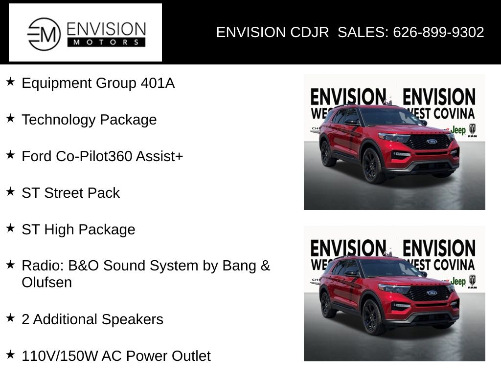 WE SPECIALIZE IN ALL CREDIT PROFILES! See what we can do for you! Call to find out (626) 899-9302.Clean CARFAX.Odometer is 6765 miles below market average! 4WD, 10.1" LCD Capacitive Portrait Touchscreen, 110V/150W AC Power Outlet, 2 Additional Speakers, 20" Machined Aluminum w/Painted Pockets Wheels, 360-Degree Camera w/Split View, Auto-Dimming Rearview Mirror (Interior), Equipment Group 401A, Evasive Steering Assist, Ford Co-Pilot360 Assist+, Front Parking Sensors, Front Rain-Sensing Wipers, Intelligent Adaptive Cruise Control, Memory Driver's Seat, Performance Front & Rear Brakes, Power Liftgate, Power Tilt/Telescoping Steering Column, Radio: B&O Sound System by Bang & Olufsen, Reverse Brake Assist, Second Row Heated Seats, Sideview Mirrors w/Gloss Black Caps, Speed Sign Recognition, ST High Package, ST Street Pack, Technology Package, Third Row PowerFold (Folds Flat), Twin Panel Moonroof, Universal Garage Door Opener (UGDO), Voice-Activated Touchscreen Navigation System, Wheels: 21" Aluminum, Wireless Charging Pad.Rapid Red Metallic Tinted Clearcoat2024 Ford Explorer ST 4WD 10-Speed Automatic 3.0L EcoBoost V6**********All Pricing and Advertised Prices for any/all vehicles offered for sale does not include dealer installed accessories which can be purchased for an additional cost.********** The Factory Rebates may not be available on this vehicle if you elect to take advantage of a Special Alternative APR or Special Lease program. Some Factory Rebates are California Resident specific and may vary for residents of other states. NO sales to Dealers, Brokers or Exporters. For out of state purchase, customers must be present to purchase. If shipping is required, dealership must facilitate; no exceptions. Please contact us for special Multi-Vehicle or Fleet pricing. Prices are plus government fees and taxes, any finance charges, $85 documentary fee, $29 electronic registration fee, any emission testing charge and $1.75 per new tire state tire fee. *** We make every effort to provide accurate information, but please verify before purchasing. Leasing & financing available on approved credit. Trade-ins accepted. Subject to prior sale.