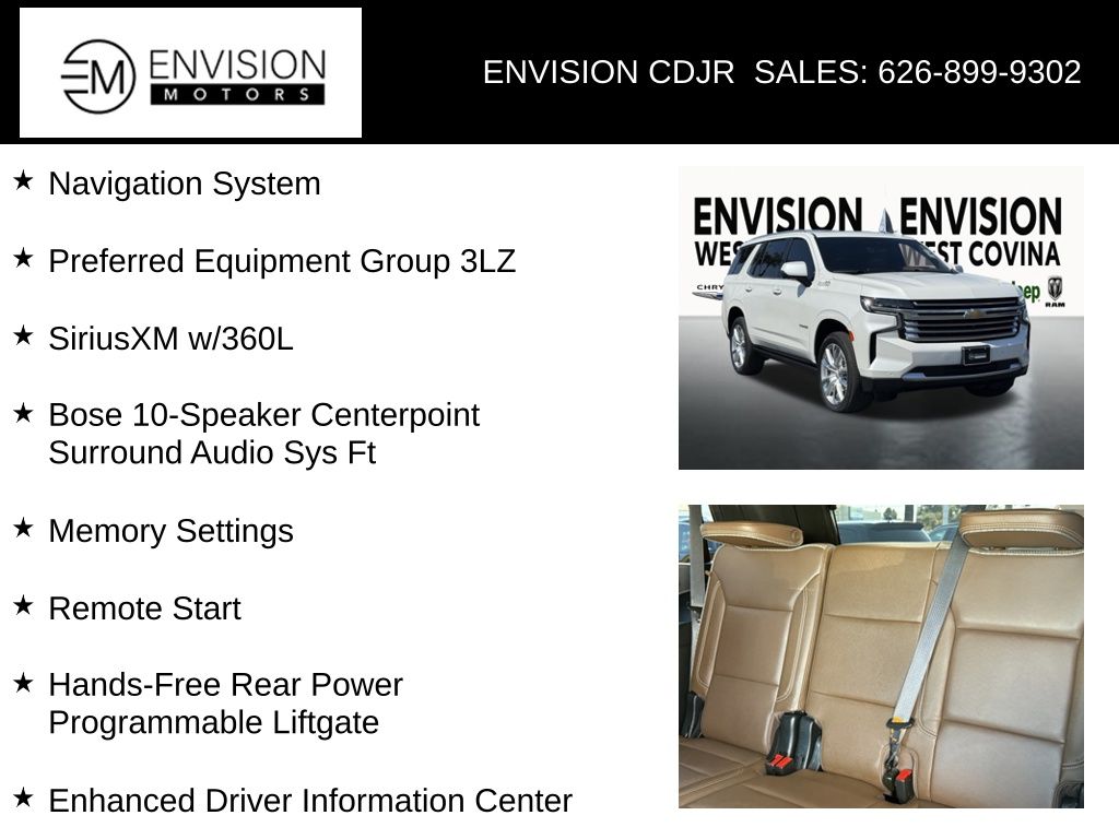 WE SPECIALIZE IN ALL CREDIT PROFILES! See what we can do for you! Call to find out (626) 899-9302.New Price! Clean CARFAX.4WD, Jet Black/Mocha Leather, 15" Diagonal Multi-Color Head-Up Display, 1st & 2nd Row Color-Keyed Carpeted Floor Mats, 2-Speed Active Electronic AutoTrac Transfer Case, 3rd Row 60/40 Power-Folding Split-Bench Seat, Adaptive Cruise Control, Bose 10-Speaker Centerpoint Surround Audio Sys Ft, Bright Front & Rear Door Sill Plates, Chrome Door Handles w/Body-Color Strip, Color-Keyed Carpeting Floor Covering, Driver & Front Outboard Passenger Airbags, Dual Exhaust System, Dual-Pane Power Panoramic Sunroof, Enhanced Automatic Emergency Braking, Enhanced Driver Information Center, Floor Console, Hands-Free Rear Power Programmable Liftgate, HD Surround Vision, Heads-Up Display, Heated 2nd Row Outboard Seats, Heated Steering Wheel, Hill Descent Control, Inside Rearview Auto-Dimming Rear Camera Mirror, Lane Change Alert w/Side Blind Zone Alert, LED Daytime Running Lamps, Memory Settings, Navigation System, Outside Heated Power-Adjustable Mirrors, Power Release 2nd Row Bucket Seats, Power Tilt & Telescopic Steering Column, Preferred Equipment Group 3LZ, Rear Camera Mirror Washer, Rear Cross Traffic Alert, Rear Pedestrian Alert, Rear Seat Media System, Remote Start, Safety Alert Seat, Set of 4 Wheel Locks (LPO), SiriusXM w/360L, Universal Home Remote, Wheels: 22" x 9" Sterling Silver Premium Painted, Wireless Charging, Wrapped Steering Wheel.Iridescent Pearl Tricoat2024 Chevrolet Tahoe High Country 4WD 10-Speed Automatic with Overdrive EcoTec3 6.2L V8**********All Pricing and Advertised Prices for any/all vehicles offered for sale does not include dealer installed accessories which can be purchased for an additional cost.********** The Factory Rebates may not be available on this vehicle if you elect to take advantage of a Special Alternative APR or Special Lease program. Some Factory Rebates are California Resident specific and may vary for residents of other states. NO sales to Dealers, Brokers or Exporters. For out of state purchase, customers must be present to purchase. If shipping is required, dealership must facilitate; no exceptions. Please contact us for special Multi-Vehicle or Fleet pricing. Prices are plus government fees and taxes, any finance charges, $85 documentary fee, $29 electronic registration fee, any emission testing charge and $1.75 per new tire state tire fee. *** We make every effort to provide accurate information, but please verify before purchasing. Leasing & financing available on approved credit. Trade-ins accepted. Subject to prior sale.