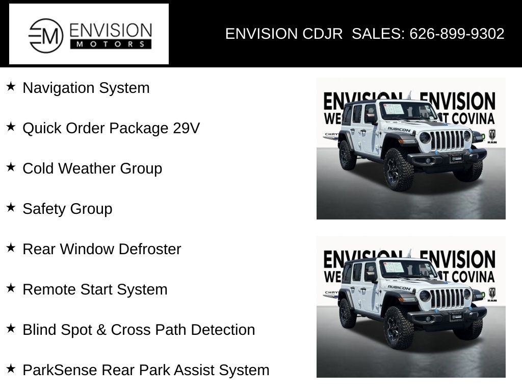 WE SPECIALIZE IN ALL CREDIT PROFILES! See what we can do for you! Call to find out (626) 899-9302.Certified. Clean CARFAX.Odometer is 8594 miles below market average! 2.0L I4 DOHC, Black 3-Piece Hard Top, Blind Spot & Cross Path Detection, Cold Weather Group, Freedom Panel Storage Bag, Heated Front Seats, Heated Steering Wheel, Navigation System, No Soft Top, ParkSense Rear Park Assist System, Quick Order Package 29V, Rear Window Defroster, Rear Window Wiper/Washer, Remote Start System, Safety Group.Bright White Clearcoat2021 Jeep Wrangler Unlimited Rubicon 4xe 4WD 8-Speed Automatic 2.0L I4 DOHCFCA US LLC Certified Pre-Owned Details: * Limited Warranty: 3 Month/3,000 Mile (whichever comes first) after new car warranty expires or from certified purchase date * Vehicles Up to 75,000 Miles and/or 5 Model Years. 24-Hour Towing & Roadside Assistance, Car Rental Allowance, CARFAX® Vehicle History ReportTM and an Introductory 3-month Subscription to SiriusXM® Satellite Radio & Certified Warranty Upgrades * Warranty Deductible: $100 * Powertrain Limited Warranty: 84 Month/100,000 Mile (whichever comes first) from original in-service date * Roadside Assistance * 125 Point Inspection * Vehicle History * Transferable Warranty**********All Pricing and Advertised Prices for any/all vehicles offered for sale does not include dealer installed accessories which can be purchased for an additional cost.********** The Factory Rebates may not be available on this vehicle if you elect to take advantage of a Special Alternative APR or Special Lease program. Some Factory Rebates are California Resident specific and may vary for residents of other states. NO sales to Dealers, Brokers or Exporters. For out of state purchase, customers must be present to purchase. If shipping is required, dealership must facilitate; no exceptions. Please contact us for special Multi-Vehicle or Fleet pricing. Prices are plus government fees and taxes, any finance charges, $85 documentary fee, $29 electronic registration fee, any emission testing charge and $1.75 per new tire state tire fee. *** We make every effort to provide accurate information, but please verify before purchasing. Leasing & financing available on approved credit. Trade-ins accepted. Subject to prior sale.