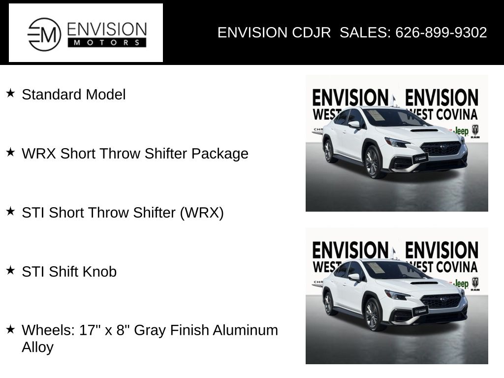 WE SPECIALIZE IN ALL CREDIT PROFILES! See what we can do for you! Call to find out (626) 899-9302.Clean CARFAX.19/26 City/Highway MPG Standard Model, STI Shift Knob, STI Short Throw Shifter (WRX), Wheels: 17" x 8" Gray Finish Aluminum Alloy, WRX Short Throw Shifter Package.Ceramic White2022 Subaru WRX AWD 6-Speed Manual 2.4L DOHC**********All Pricing and Advertised Prices for any/all vehicles offered for sale does not include dealer installed accessories which can be purchased for an additional cost.********** The Factory Rebates may not be available on this vehicle if you elect to take advantage of a Special Alternative APR or Special Lease program. Some Factory Rebates are California Resident specific and may vary for residents of other states. NO sales to Dealers, Brokers or Exporters. For out of state purchase, customers must be present to purchase. If shipping is required, dealership must facilitate; no exceptions. Please contact us for special Multi-Vehicle or Fleet pricing. Prices are plus government fees and taxes, any finance charges, $85 documentary fee, $29 electronic registration fee, any emission testing charge and $1.75 per new tire state tire fee. *** We make every effort to provide accurate information, but please verify before purchasing. Leasing & financing available on approved credit. Trade-ins accepted. Subject to prior sale.Awards: * ALG Residual Value Awards, Residual Value Awards