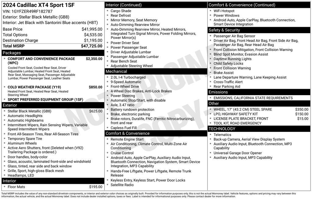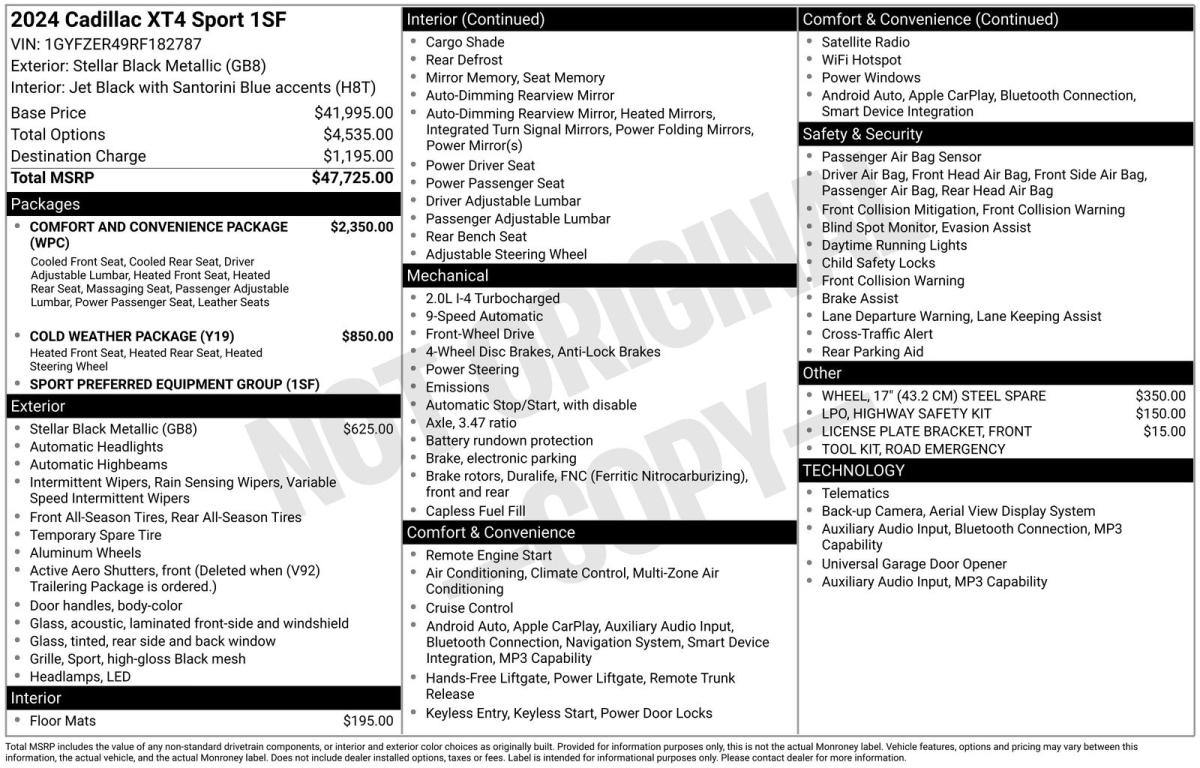 Discover the Captivating 2024 Cadillac XT4 Sport – A Refined Crossover Tailored for Your Driving PleasureIndulge in the sophisticated allure of the 2024 Cadillac XT4 Sport, a crossover that seamlessly blends dynamic performance, cutting-edge technology, and unparalleled comfort. This meticulously crafted vehicle is the perfect companion for those who demand the best in automotive excellence.Elevate your driving experience with the following premium features:• Comfort and Convenience Package• Cold Weather Package• Stellar Black Metallic ExteriorImmerse yourself in the advanced technology that defines the XT4 Sport, including:• Navigation system: Google Automotive Services Capable• 7-Speaker Audio System• SiriusXM w/360L• 8-Way Power Passenger Seat Adjuster• Memory Seat• Power Driver Seat• Manual Rake & Telescopic Steering Column• Power Liftgate• Electronic Cruise Control w/Set & Resume Speed• Auto-Dimming Inside Rear-View Mirror• Automatic Emergency Braking• HD Rear Vision Camera• Heated Steering Wheel• Leather Steering Wheel• Heated Driver & Front Passenger Seats• Heated Rear Outboard Seating Positions• Power Lumbar Massage Driver Seat• Power Lumbar Massage Front Passenger Seat• Ventilated Driver & Front Passenger Seats• 18" Split 5-Spoke Alloy WheelsThe XT4 Sport's 2.0L I4 Turbocharged engine, paired with a 9-Speed Automatic transmission and Front-Wheel Drive, delivers an exceptional blend of power and efficiency, with an EPA-estimated 24 city/29 highway MPG.Designed to elevate your driving experience, the XT4 Sport is a true masterpiece of automotive engineering. With its striking Black exterior, the XT4 Sport exudes a commanding presence that is sure to turn heads wherever you go.Indulge in the ultimate luxury crossover experience. Discover the 2024 Cadillac XT4 Sport today and let it take you on a journey of unparalleled driving pleasure.