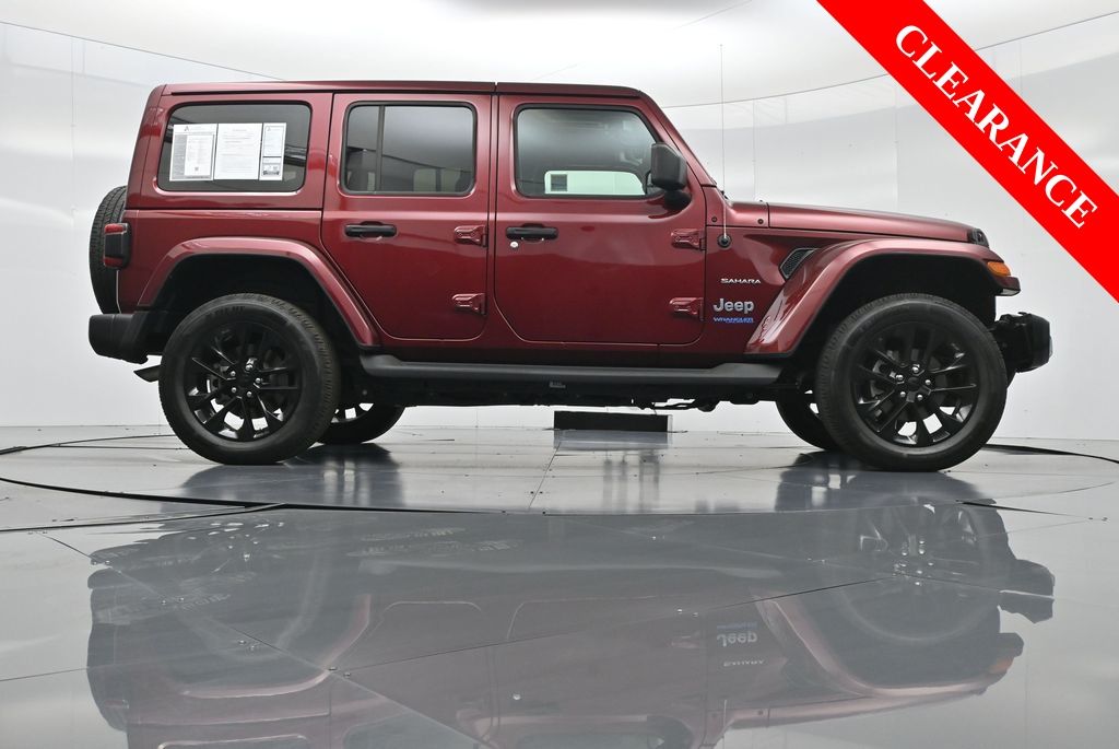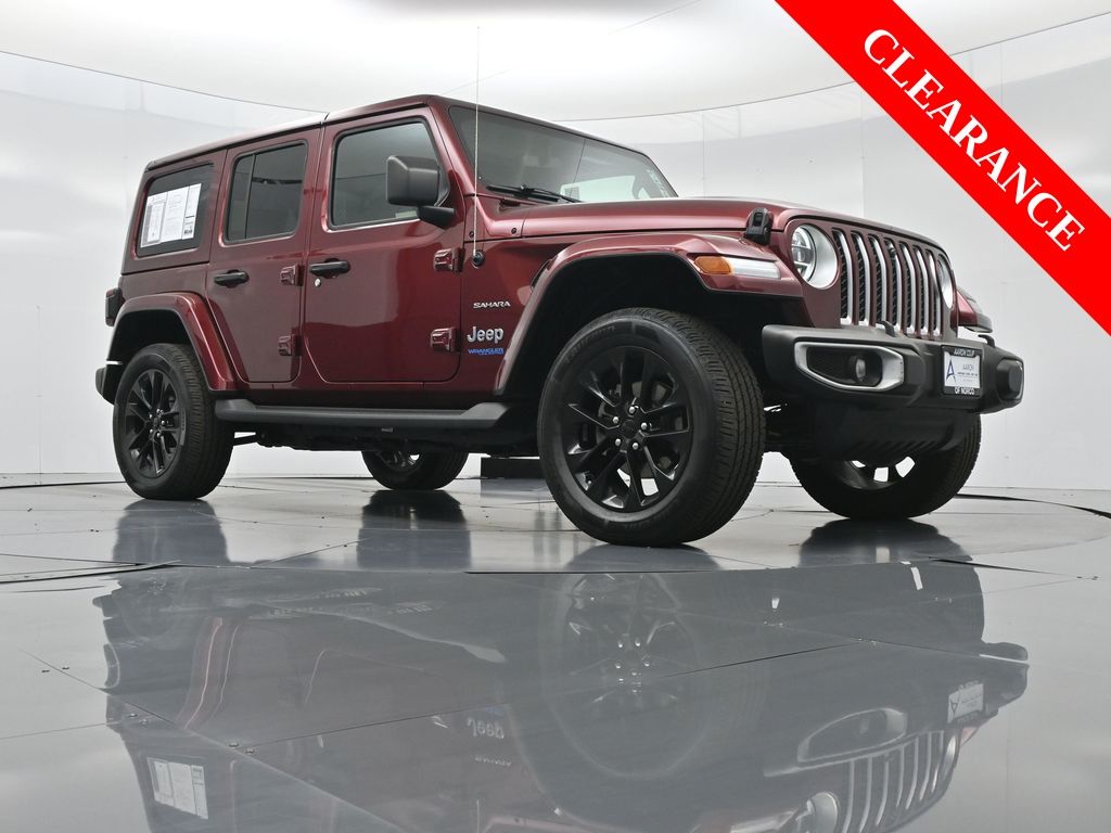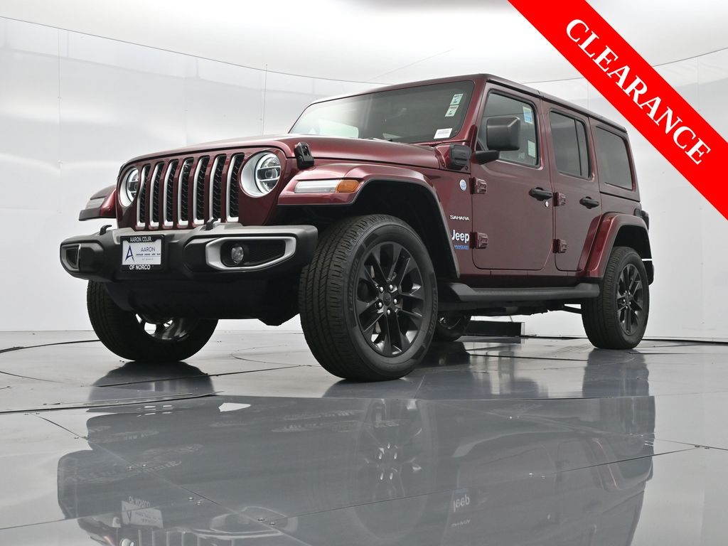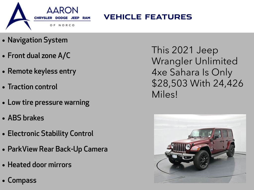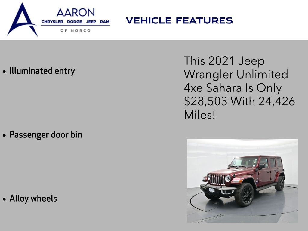 2021 Jeep Wrangler Unlimited Sahara 4xe, plug-in hybrid 2.0L I4, 8-speed auto 4x4, 1-Owner, just over 24,000 miles, 49 MPGe / 20 MPG gas only.Equipped with Customer Preferred Package 2.0E, body-color 3-piece hard top, freedom panel storage bag, and integrated off-road camera. Para la version en espanol, vea abajo.Trail-rated hardware includes Selec-Trac full-time 4WD system, Dana axles, skid plates, tow hooks, hill-start assist, and regenerative braking for hybrid efficiency.Comfort features include leather-trimmed seats with Sahara logo, 8.4-inch Uconnect NAV with Alpine Premium Audio, Apple CarPlay, Android Auto, remote start, power heated mirrors, and automatic temperature control.Open-air design brings versatility with removable hard top panels, full-size spare, rear window defroster/wiper, LED lighting group, and premium wheels.We keep it straightforward with transparent pricing, thorough reconditioning, and easy financing. Our no-pressure team is here to answer questions and provide a stress-free process. Take the next step by messaging us for a personalized quote or to schedule a convenient test drive.2021 Jeep Wrangler Unlimited Sahara 4xe, hibrido enchufable 2.0L I4, transmision automatica de 8 velocidades, 4x4, 1 dueno, poco mas de 24,000 millas, 49 MPGe / 20 MPG solo gasolina.Equipado con el paquete preferido 2.0E, techo rigido de 3 piezas al color de la carroceria, bolsa de almacenamiento para paneles Freedom y camara todoterreno integrada.Incluye hardware Trail Rated con traccion 4WD Selec-Trac, ejes Dana, placas protectoras, ganchos de remolque, asistente de arranque en pendiente y frenado regenerativo para eficiencia hibrida.Las comodidades abarcan asientos en piel con logo Sahara, Uconnect NAV de 8.4 pulgadas con audio Alpine Premium, Apple CarPlay, Android Auto, encendido remoto, espejos calefactables y control automatico de temperatura.El diseno abierto aporta versatilidad con paneles desmontables de techo rigido, llanta de refaccion completa, desempanador/limpiador trasero, paquete de luces LED y rines premium.Mantenemos un proceso transparente, reacondicionamiento minucioso y financiamiento sencillo. Nuestro equipo sin presion esta listo para responder tus dudas y darte tranquilidad. Da el siguiente paso escribiendonos para una cotizacion personalizada o para agendar una prueba de manejo conveniente.