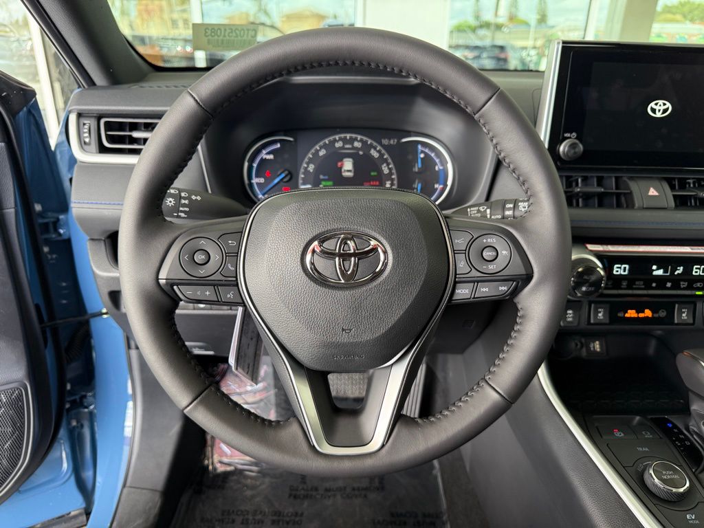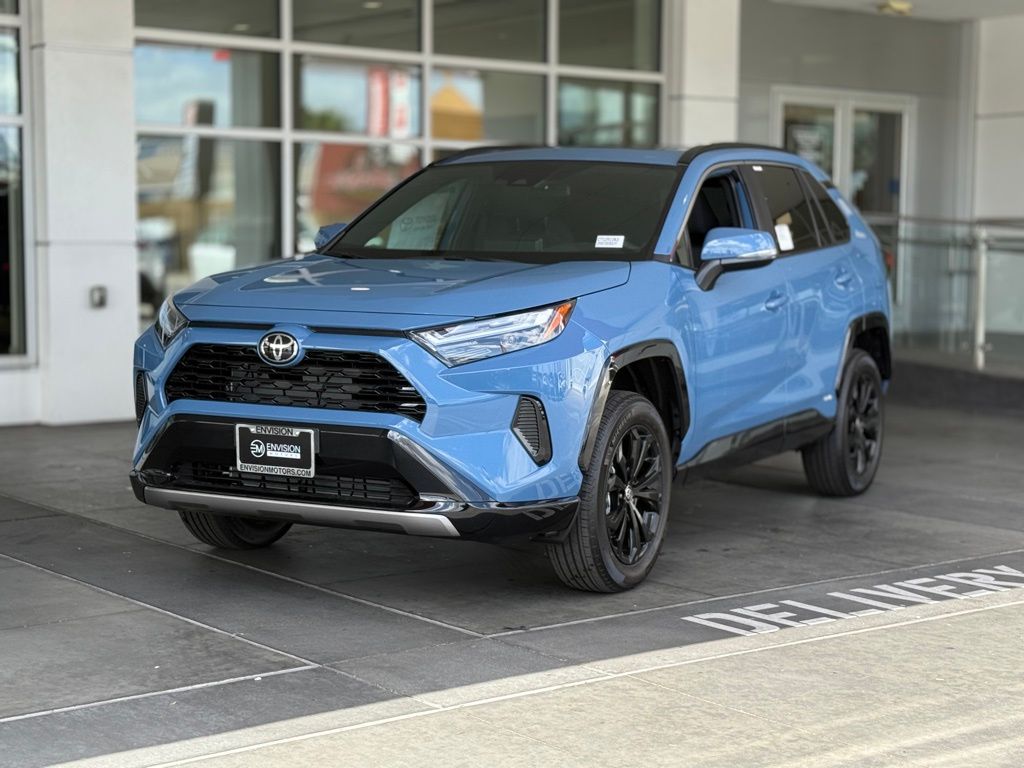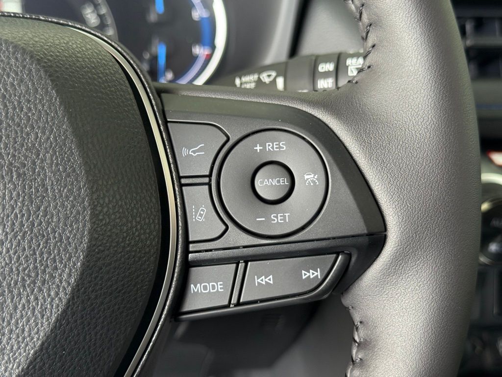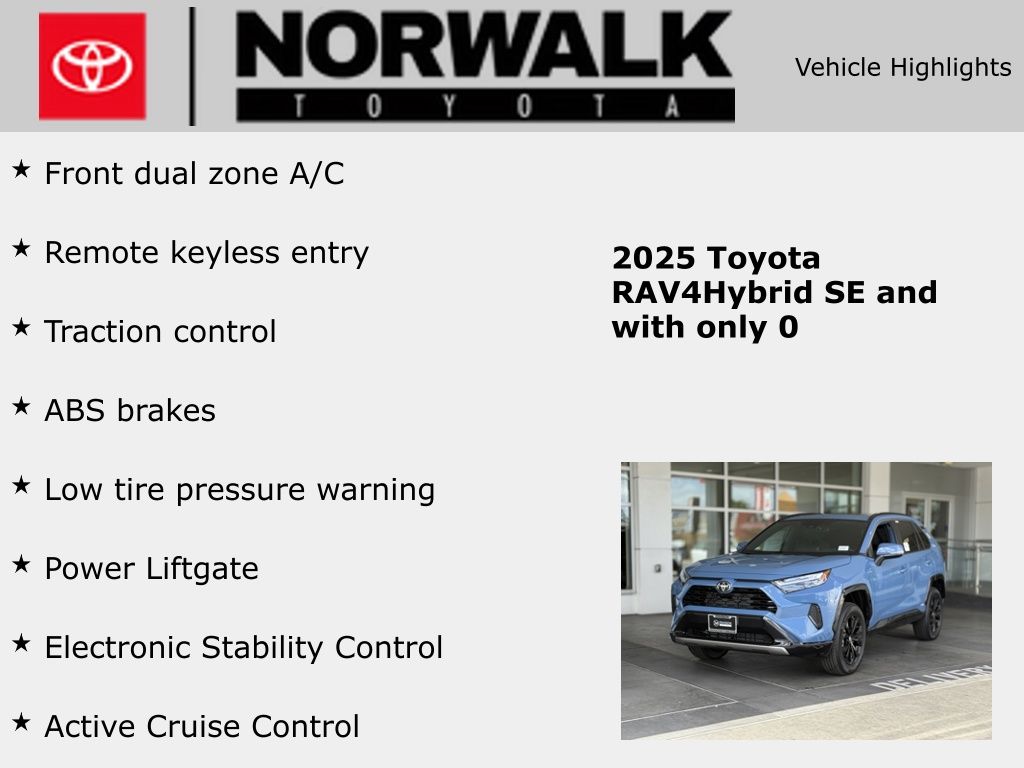 Cavalry Blue 2025 Toyota RAV4 Hybrid SE AWD eCVT 2.5L 4-Cylinder 2.5L 4-Cylinder, ABS brakes, Active Cruise Control, Alloy wheels, Electronic Stability Control, Front dual zone A/C, Heated door mirrors, Illuminated entry, Low tire pressure warning, Power Liftgate, Remote keyless entry, Traction control.41/38 City/Highway MPG