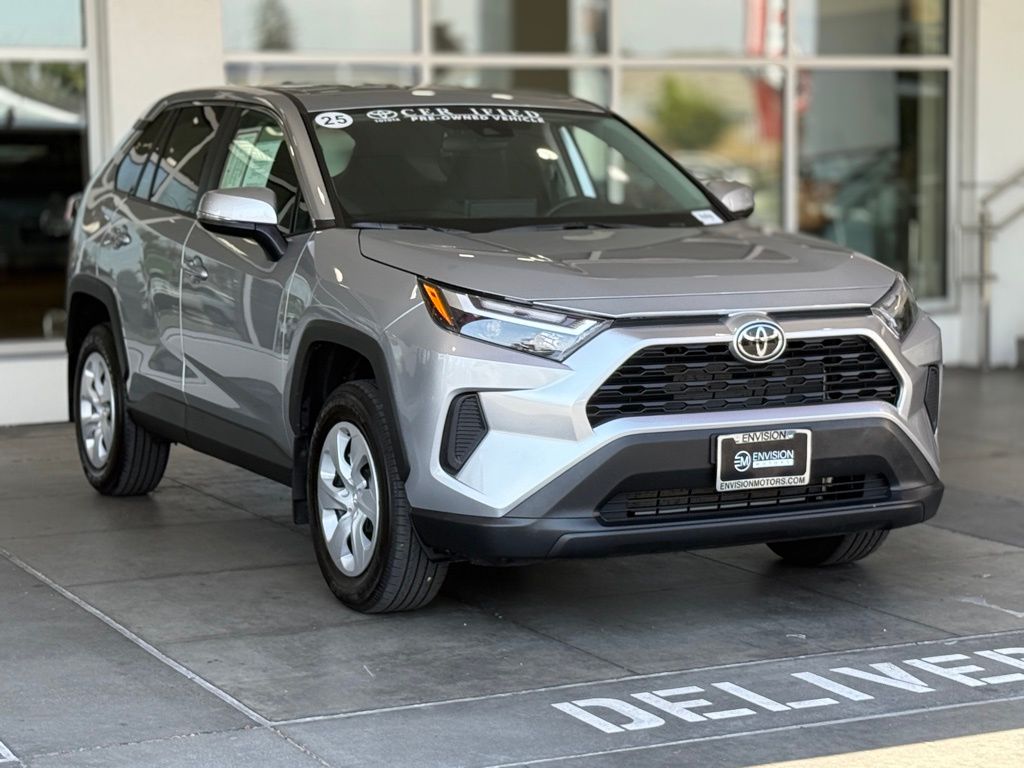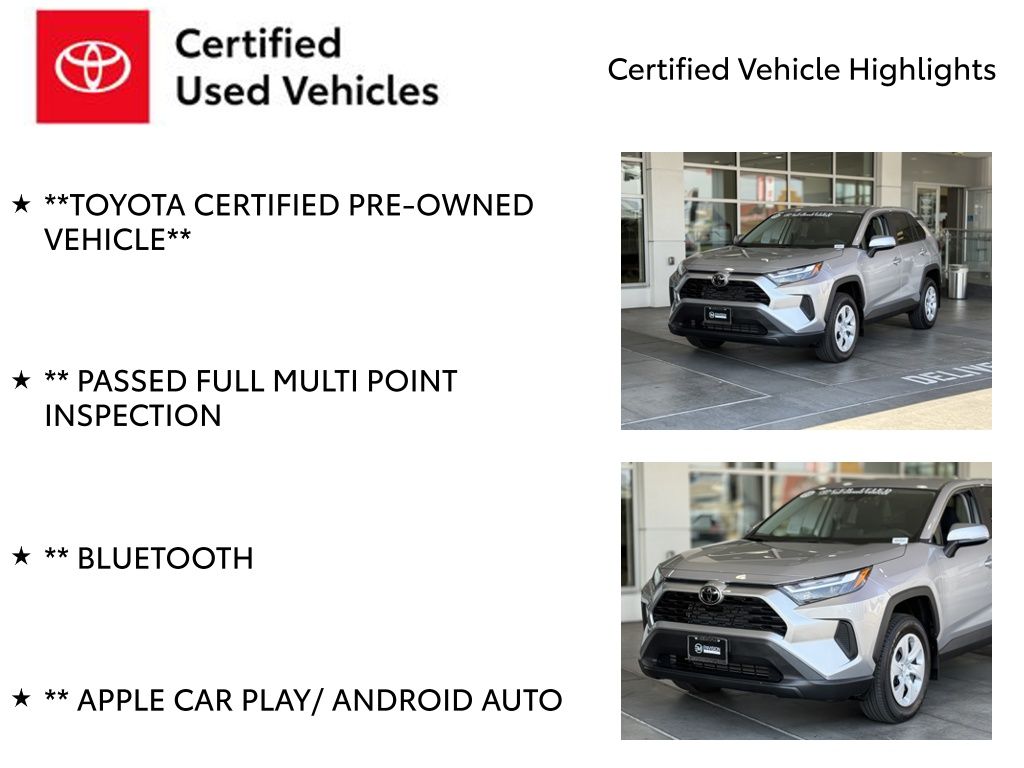 Certified.**TOYOTA CERTIFIED PRE-OWNED VEHICLE**, ** PASSED FULL MULTI POINT INSPECTION, ** BLUETOOTH, ** APPLE CAR PLAY/ ANDROID AUTO, Toyota Safety Sense 2.5 w/ Pre-Collision 8 Airbags; Star Safety System Connected Services Capable. 4G Network Dependent. See Toyota.com For Details. LATCH-Lower Anchor & Tether For CHildren Backup Camera w/ Dynamic Gridlines, Black w/Fabric Seat Trim, 17" Steel Wheels, 4-Wheel Disc Brakes, 6 Speakers, ABS brakes, Air Conditioning, All Weather Floor Liners & Cargo Liner (TMS), AM/FM radio: SiriusXM, Auto High-beam Headlights, Blind Spot Monitor (BSM) w/Lane Change Assist, Brake assist, Bumpers: body-color, Door Edge Guard (TMS), Driver door bin, Driver vanity mirror, Dual front impact airbags, Dual front side impact airbags, Electronic Stability Control, Emergency communication system: Safety Connect (10-year trial), Exterior Parking Camera Rear, Fabric Seat Trim, Four wheel independent suspension, Front anti-roll bar, Front Bucket Seats, Front Center Armrest, Front reading lights, Illuminated entry, Knee airbag, Low tire pressure warning, Mudguards (TMS), Occupant sensing airbag, Outside temperature display, Overhead airbag, Overhead console, Panic alarm, Passenger door bin, Passenger vanity mirror, Power door mirrors, Power steering, Power windows, Radio data system, Radio: AM/FM/XM Audio System, Rear anti-roll bar, Rear Cargo Area Cover, Rear seat center armrest, Rear window defroster, Rear window wiper, Remote keyless entry, Speed control, Speed-sensing steering, Split folding rear seat, Spoiler, Steering wheel mounted audio controls, Tachometer, Telescoping steering wheel, Tilt steering wheel, Traction control, Trip computer.Silver Sky Metallic 2025 Toyota RAV4 LE FWD 8-Speed Automatic 2.5L 4-Cylinder DOHC Dual VVT-i27/35 City/Highway MPGToyota Gold Certified Details: * Vehicle History * Limited Warranty: 12 Month/12,000 Mile Limited Comprehensive Warranty: 12 Month/12,000 Mile (whichever comes first) from certified purchase date * 160 Point Inspection * Roadside Assistance for 7 Year / 100,000 Mile. Standard New-Car Financing Rates Available. Warranty honored at over 1,400 Toyota dealers in the continental U.S. & Canada. Trade-ins accepted. Trouble-free handling of your transaction, including DMV paperwork * Transferable Warranty * Warranty Deductible: $0 * Roadside Assistance * Powertrain Limited Warranty: 84 Month/100,000 Mile (whichever comes first) from TCUV purchase date*Vehicle may have dealer added equipment not reflected in price.