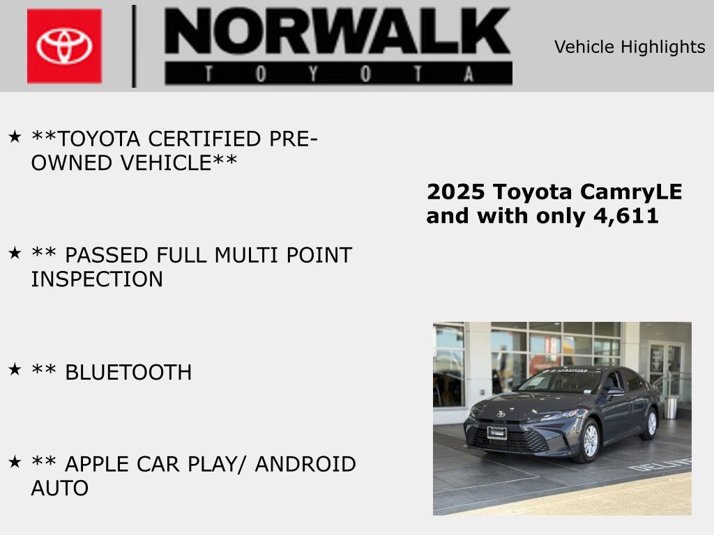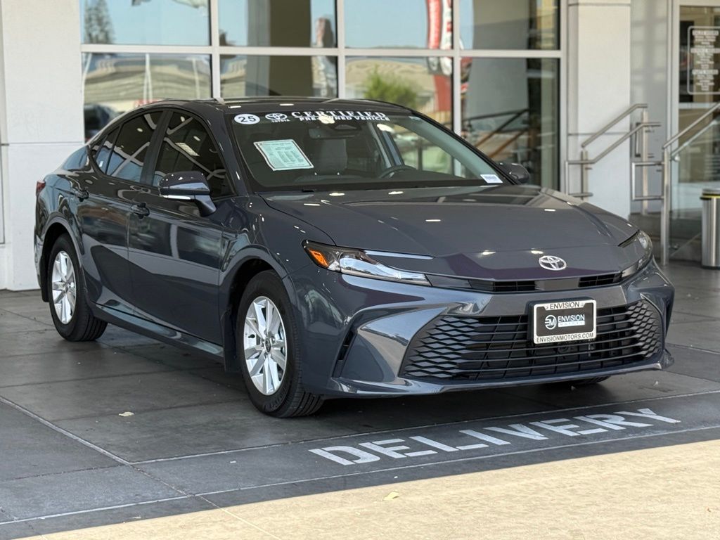 Clean CARFAX.**TOYOTA CERTIFIED PRE-OWNED VEHICLE**, ** PASSED FULL MULTI POINT INSPECTION, ** BLUETOOTH, ** APPLE CAR PLAY/ ANDROID AUTO, Toyota Safety Sense 3.0 w/Pre-Collision Blind Spot Monitor w/Rear-Cross Traffic Alert Connected Services Capable. 4G Network Dependent. See Toyota.com for details., 2.5L 4-Cylinder 16V DOHC, Boulder Cloth, 4-Wheel Disc Brakes, 6 Speakers, 8-Way Power-Adjustable Front Driver's Seat, ABS brakes, Air Conditioning, All Weather Floor Protection (TMS), Alloy wheels, AM/FM radio: SiriusXM, Apple CarPlay/Android Auto, Auto High-beam Headlights, Auto-Dimming Rearview Mirror w/HomeLink, Automatic temperature control, Brake assist, Bumpers: body-color, Convenience Package, Delay-off headlights, Driver door bin, Driver vanity mirror, Driver-Side Seatback Pocket, Dual front impact airbags, Dual front side impact airbags, Electronic Stability Control, Emergency communication system: Safety Connect (up to 10-year trial subscription), Exterior Parking Camera Rear, Fabric Seat Trim, Four wheel independent suspension, Front anti-roll bar, Front Bucket Seats, Front Center Armrest, Front dual zone A/C, Front reading lights, Fully automatic headlights, Heated door mirrors, Illuminated entry, Knee airbag, Low tire pressure warning, Mudguards (TMS), Occupant sensing airbag, Outside temperature display, Overhead airbag, Overhead console, Panic alarm, Passenger door bin, Passenger vanity mirror, Power door mirrors, Power steering, Power windows, Quick Charge Cables (TMS), Radio data system, Radio: Toyota Audio Multimedia w/8" Touchscreen, Rear anti-roll bar, Rear Bumper Applique (TMS), Rear seat center armrest, Rear side impact airbag, Rear window defroster, Remote keyless entry, Security system, Smart Key System, Speed control, Speed-sensing steering, Split folding rear seat, Steering wheel mounted audio controls, Telescoping steering wheel, Tilt steering wheel, Traction control, Trip computer, Trunk LED Bulb (TMS), Turn signal indicator mirrors, Variably intermittent wipers, Wheels: 16" Silver-Finished Alloy.Underground 2025 Toyota Camry LE FWD eCVT 2.5L 4-Cylinder 16V DOHCOdometer is 6847 miles below market average! 53/50 City/Highway MPG*Vehicle may have dealer added equipment not reflected in price.