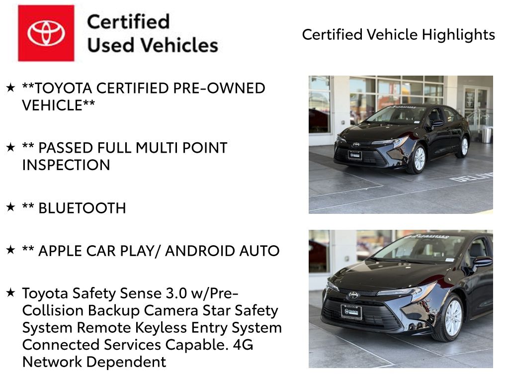 Certified. Clean CARFAX.**TOYOTA CERTIFIED PRE-OWNED VEHICLE**, ** PASSED FULL MULTI POINT INSPECTION, ** BLUETOOTH, ** APPLE CAR PLAY/ ANDROID AUTO, Toyota Safety Sense 3.0 w/Pre-Collision Backup Camera Star Safety System Remote Keyless Entry System Connected Services Capable. 4G Network Dependent, 16" Alloy Wheels, 4-Wheel Disc Brakes, 6 Speakers, ABS brakes, Air Conditioning, All Weather Floor Liner Package: Tub Style (TMS), AM/FM radio: SiriusXM, Apple CarPlay/Android Auto, Auto High-beam Headlights, Automatic temperature control, Black Badge Overlays (TMS), Blind Spot Monitor, Brake assist, Bumpers: body-color, Color-Keyed Heated Power Outside Mirrors, Delay-off headlights, Door Edge Guards (TMS), Driver door bin, Driver vanity mirror, Dual front impact airbags, Dual front side impact airbags, Electronic Stability Control, Emergency communication system: Safety Connect (up to 10-year trial subscription), Exterior Parking Camera Rear, Fabric Seat Trim, Front anti-roll bar, Front Bucket Seats, Front Center Armrest, Front reading lights, Front wheel independent suspension, Fully automatic headlights, Illuminated entry, Knee airbag, LE Premium Package, Low tire pressure warning, Occupant sensing airbag, Outside temperature display, Overhead airbag, Panic alarm, Passenger door bin, Passenger vanity mirror, Power door mirrors, Power steering, Power windows, Qi-Compatible Wireless Charger, Quick Charge Cable (TMS), Radio data system, Radio: 8" Toyota Audio Multimedia, Rear anti-roll bar, Rear Bumper Protector (TMS), Rear seat center armrest, Rear side impact airbag, Rear window defroster, Remote keyless entry, Smart Key System, Speed control, Split folding rear seat, Steering wheel mounted audio controls, Tachometer, Telescoping steering wheel, Tilt steering wheel, Traction control, Trip computer.Midnight Black 2025 Toyota Corolla LE FWD CVT 2.0L I4 DOHC 16VOdometer is 4405 miles below market average! 32/41 City/Highway MPGToyota Gold Certified Details: * 160 Point Inspection * Limited Warranty: 12 Month/12,000 Mile Limited Comprehensive Warranty: 12 Month/12,000 Mile (whichever comes first) from certified purchase date * Vehicle History * Transferable Warranty * Roadside Assistance * Warranty Deductible: $0 * Powertrain Limited Warranty: 84 Month/100,000 Mile (whichever comes first) from TCUV purchase date * Roadside Assistance for 7 Year / 100,000 Mile. Standard New-Car Financing Rates Available. Warranty honored at over 1,400 Toyota dealers in the continental U.S. & Canada. Trade-ins accepted. Trouble-free handling of your transaction, including DMV paperwork*Vehicle may have dealer added equipment not reflected in price.