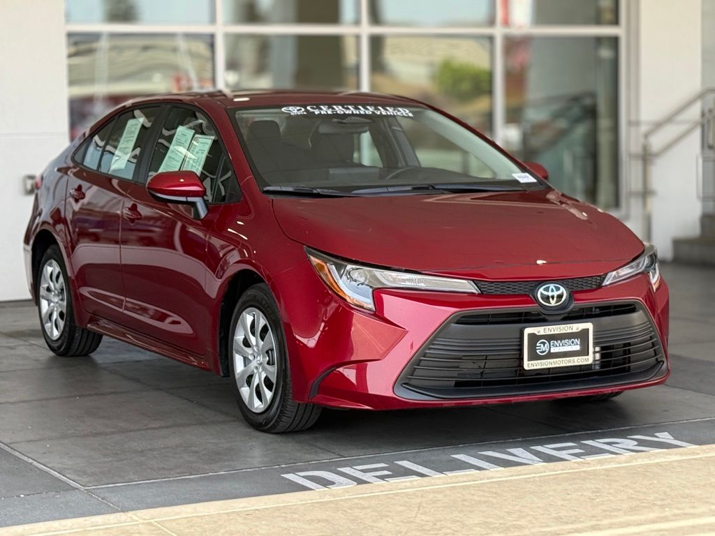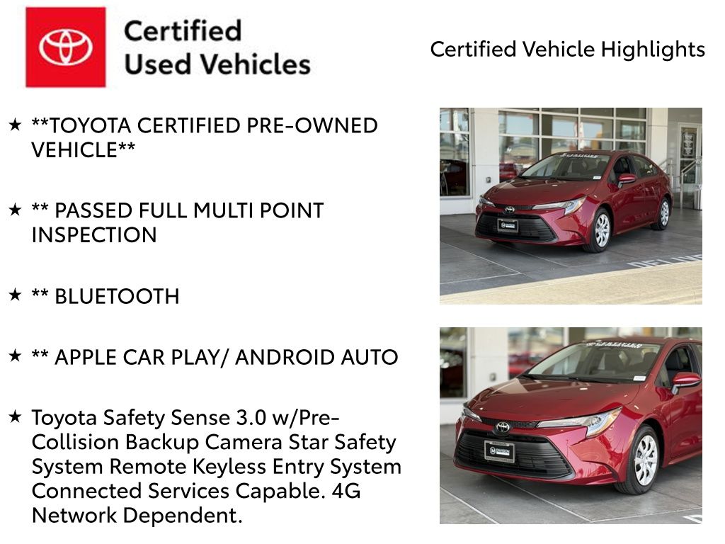Certified. Clean CARFAX.**TOYOTA CERTIFIED PRE-OWNED VEHICLE**, ** PASSED FULL MULTI POINT INSPECTION, ** BLUETOOTH, ** APPLE CAR PLAY/ ANDROID AUTO, Toyota Safety Sense 3.0 w/Pre-Collision Backup Camera Star Safety System Remote Keyless Entry System Connected Services Capable. 4G Network Dependent., 16" Steel Wheels w/Covers, 4-Wheel Disc Brakes, 6 Speakers, ABS brakes, Air Conditioning, AM/FM radio: SiriusXM, Apple CarPlay/Android Auto, Auto High-beam Headlights, Brake assist, Bumpers: body-color, Delay-off headlights, Driver door bin, Driver vanity mirror, Dual front impact airbags, Dual front side impact airbags, Electronic Stability Control, Emergency communication system: Safety Connect (up to 10-year trial subscription), Exterior Parking Camera Rear, Fabric Seat Trim, Front anti-roll bar, Front Bucket Seats, Front Center Armrest, Front reading lights, Front wheel independent suspension, Fully automatic headlights, Illuminated entry, Knee airbag, Low tire pressure warning, Occupant sensing airbag, Outside temperature display, Overhead airbag, Panic alarm, Passenger door bin, Passenger vanity mirror, Power door mirrors, Power steering, Power windows, Radio data system, Radio: 8" Toyota Audio Multimedia, Rear anti-roll bar, Rear seat center armrest, Rear side impact airbag, Rear window defroster, Remote keyless entry, Speed control, Split folding rear seat, Steering wheel mounted audio controls, Tachometer, Telescoping steering wheel, Tilt steering wheel, Traction control, Trip computer.Ruby Flare Pearl 2025 Toyota Corolla LE FWD CVT 2.0L I4 DOHC 16VOdometer is 1635 miles below market average! 32/41 City/Highway MPGToyota Gold Certified Details: * Roadside Assistance for 7 Year / 100,000 Mile. Standard New-Car Financing Rates Available. Warranty honored at over 1,400 Toyota dealers in the continental U.S. & Canada. Trade-ins accepted. Trouble-free handling of your transaction, including DMV paperwork * Transferable Warranty * Roadside Assistance * Limited Warranty: 12 Month/12,000 Mile Limited Comprehensive Warranty: 12 Month/12,000 Mile (whichever comes first) from certified purchase date * Vehicle History * Warranty Deductible: $0 * Powertrain Limited Warranty: 84 Month/100,000 Mile (whichever comes first) from TCUV purchase date * 160 Point Inspection*Vehicle may have dealer added equipment not reflected in price.