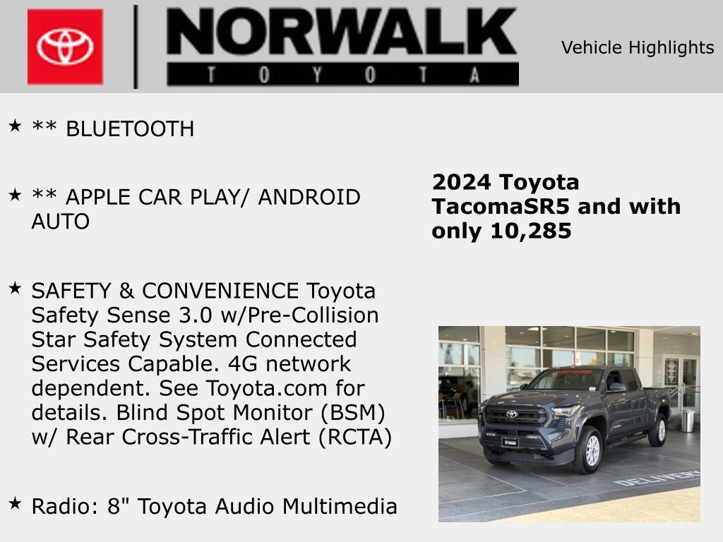 Clean CARFAX.** BLUETOOTH, ** APPLE CAR PLAY/ ANDROID AUTO, SAFETY & CONVENIENCE Toyota Safety Sense 3.0 w/Pre-Collision Star Safety System Connected Services Capable. 4G network dependent. See Toyota.com for details. Blind Spot Monitor (BSM) w/ Rear Cross-Traffic Alert (RCTA), 3.583 Axle Ratio, 4-Wheel Disc Brakes, 6 Speakers, ABS brakes, Air Conditioning, All Weather Floor Liners (TMS), Alloy wheels, AM/FM radio: SiriusXM, Anti-whiplash front head restraints, Apple CarPlay/Android Auto, Auto High-beam Headlights, Auto-dimming Rear-View mirror, Black Oval Tube Step (TMS), Brake assist, Bumpers: body-color, Chrome Exhaust Tip (TMS), Door Edge Guard (TMS), Driver door bin, Dual front impact airbags, Dual front side impact airbags, Electronic Stability Control, Emergency communication system: Safety Connect (1-year trial), Exterior Parking Camera Rear, Four wheel independent suspension, Front & Rear Mud Guards, Front anti-roll bar, Front Bucket Seats, Front Center Armrest, Front fog lights, Front reading lights, Fully automatic headlights, Gunmetal Tailgate Insert (TMS), Heated door mirrors, Illuminated entry, Knee airbag, Low tire pressure warning, Occupant sensing airbag, Outside temperature display, Overhead airbag, Overhead console, Panic alarm, Passenger door bin, Phone Cables - Smart USB (TMS), Power door mirrors, Power steering, Power windows, Radio: 8" Toyota Audio Multimedia, Rear step bumper, Rear window defroster, Remote keyless entry, Speed control, Speed-sensing steering, Split folding rear seat, Spray-On Bed Liner (TMS), Steering wheel mounted audio controls, Tachometer, Telescoping steering wheel, Tilt steering wheel, Traction control, Trip computer, Variably intermittent wipers, Wheel Locks (TMS), Wheels: 17" Styled Alloy.Underground 2024 Toyota Tacoma SR5 RWD 8-Speed Automatic 2.4L 4-CylinderOdometer is 6298 miles below market average! 21/26 City/Highway MPG*Vehicle may have dealer added equipment not reflected in price.