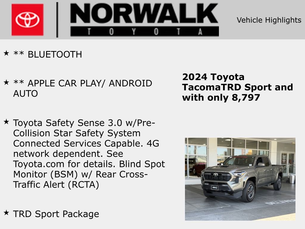 Clean CARFAX.** BLUETOOTH, ** APPLE CAR PLAY/ ANDROID AUTO, Toyota Safety Sense 3.0 w/Pre-Collision Star Safety System Connected Services Capable. 4G network dependent. See Toyota.com for details. Blind Spot Monitor (BSM) w/ Rear Cross-Traffic Alert (RCTA), 3.583 Axle Ratio, 4-Wheel Disc Brakes, 6 Speakers, ABS brakes, Air Conditioning, All Weather Floor Liners (TMS), Alloy wheels, AM/FM radio: SiriusXM, Anti-whiplash front head restraints, Apple CarPlay/Android Auto, Auto High-beam Headlights, Auto-dimming Rear-View mirror, Black Chrome Exhaust Tip (TMS), Brake assist, Bumpers: body-color, Driver door bin, Dual front impact airbags, Dual front side impact airbags, Electronic Stability Control, Emergency communication system: Safety Connect (1-year trial), Exterior Parking Camera Rear, Four wheel independent suspension, Front & Rear Mud Guards, Front anti-roll bar, Front Bucket Seats, Front Center Armrest, Front fog lights, Front reading lights, Fully automatic headlights, Gunmetal Tailgate Insert (TMS), Heated door mirrors, Illuminated entry, Knee airbag, Low tire pressure warning, Occupant sensing airbag, Outside temperature display, Overhead airbag, Overhead console, Panic alarm, Passenger door bin, Power door mirrors, Power steering, Power windows, Radio: 8" Toyota Audio Multimedia, Rear step bumper, Rear window defroster, Remote keyless entry, Speed control, Speed-sensing steering, Split folding rear seat, Steering wheel mounted audio controls, Tachometer, Telescoping steering wheel, Tilt steering wheel, Traction control, TRD Sport Package, Trip computer, Variably intermittent wipers.Bronze Oxide 2024 Toyota Tacoma TRD Sport RWD 8-Speed Automatic 2.4L 4-CylinderOdometer is 2204 miles below market average!*Vehicle may have dealer added equipment not reflected in price.