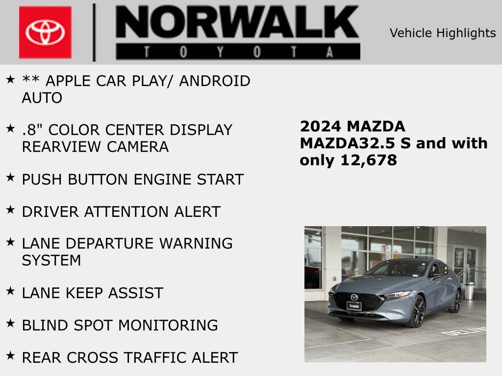 Clean CARFAX.** APPLE CAR PLAY/ ANDROID AUTO, .8" COLOR CENTER DISPLAY REARVIEW CAMERA, PUSH BUTTON ENGINE START, DRIVER ATTENTION ALERT, LANE DEPARTURE WARNING SYSTEM, LANE KEEP ASSIST, BLIND SPOT MONITORING, REAR CROSS TRAFFIC ALERT, SMART BRAKE SUPPORT, MAZDA RADAR CRUISE CONTROL, 4-Wheel Disc Brakes, 8 Speakers, ABS brakes, Air Conditioning, Alloy wheels, AM/FM radio, Auto High-beam Headlights, Automatic temperature control, Brake assist, Bumpers: body-color, Compass, Delay-off headlights, Driver door bin, Driver vanity mirror, Dual front impact airbags, Dual front side impact airbags, Electronic Stability Control, Exterior Parking Camera Rear, Front anti-roll bar, Front Bucket Seats, Front Center Armrest, Front dual zone A/C, Front reading lights, Front wheel independent suspension, Fully automatic headlights, Heated door mirrors, Heated Front Bucket Seats, Heated front seats, Illuminated entry, Knee airbag, Leather Seat Trim, Leather Shift Knob, Leather steering wheel, Low tire pressure warning, MAZDA CONNECT Infotainment System, Memory seat, Occupant sensing airbag, Outside temperature display, Overhead airbag, Overhead console, Panic alarm, Passenger door bin, Passenger vanity mirror, Power door mirrors, Power driver seat, Power moonroof, Power steering, Power windows, Radio data system, Radio: AM/FM/HD Audio System, Rain sensing wipers, Rear seat center armrest, Rear side impact airbag, Rear window defroster, Rear window wiper, Remote keyless entry, Speed control, Speed-sensing steering, Split folding rear seat, Spoiler, Steering wheel mounted audio controls, Tachometer, Telescoping steering wheel, Tilt steering wheel, Traction control, Trip computer, Turn signal indicator mirrors, Variably intermittent wipers, Wheels: 18" x 7J Aluminum Alloy.Polymetal Gray Metallic 2024 Mazda Mazda3 2.5 S Carbon Edition AWD 6-Speed Automatic SKYACTIV® 2.5L 4-Cylinder DOHC 16VOdometer is 6568 miles below market average! 26/33 City/Highway MPG*Vehicle may have dealer added equipment not reflected in price.