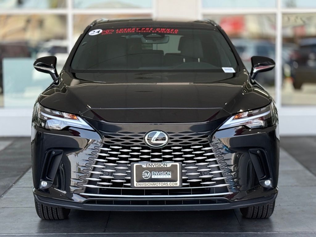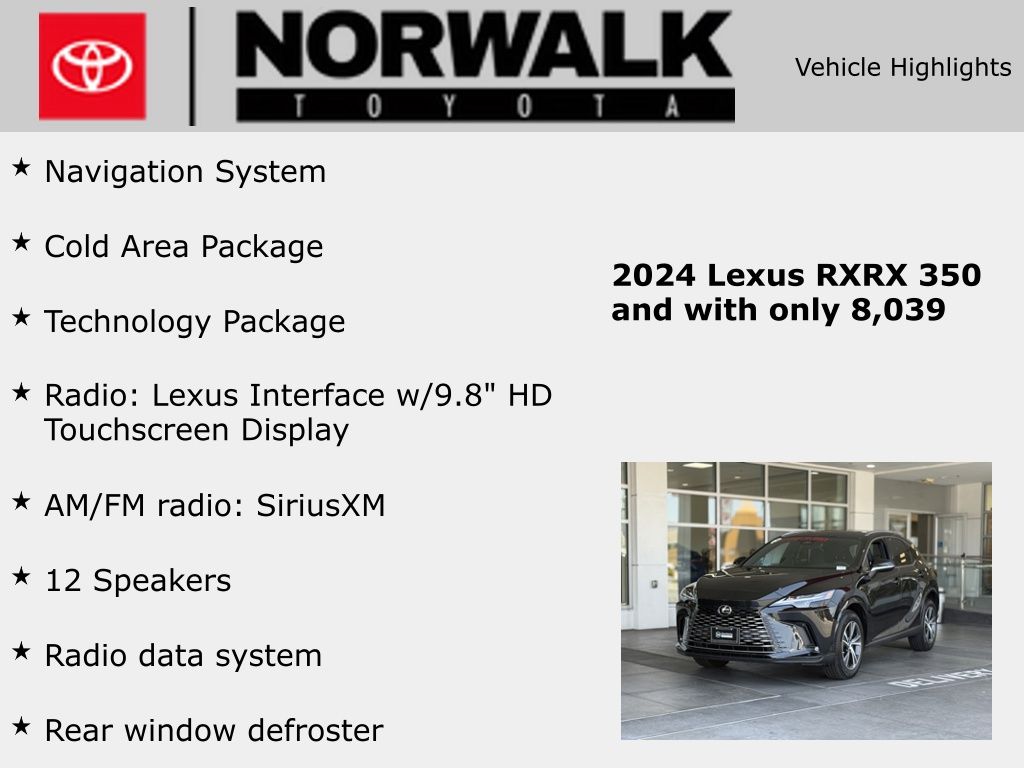 Clean CARFAX.Black w/Black Cascade Trim w/NuLuxe Seat Trim, 12 Speakers, 19" Wheels, 3.33 Axle Ratio, 4-Wheel Disc Brakes, ABS brakes, Air Conditioning, Alloy wheels, AM/FM radio: SiriusXM, Anti-whiplash front head restraints, Auto High-beam Headlights, Auto-dimming door mirrors, Auto-dimming Rear-View mirror, Automatic temperature control, Brake assist, Bumpers: body-color, Cold Area Package, Compass, Delay-off headlights, Driver door bin, Driver vanity mirror, Dual front impact airbags, Dual front side impact airbags, Electronic Stability Control, Emergency communication system: Safety Connect (10-year trial), Exterior Parking Camera Rear, Four wheel independent suspension, Front anti-roll bar, Front Bucket Seats, Front Center Armrest, Front dual zone A/C, Front fog lights, Front reading lights, Fully automatic headlights, Garage door transmitter: HomeLink, Genuine wood console insert, Heated door mirrors, Heated Front Bucket Seats, Heated front seats, Heated Leather Steering Wheel w/Paddle Shifters, Illuminated entry, Leather Shift Knob, Leather steering wheel, Low tire pressure warning, Navigation System, NuLuxe Seat Trim, Occupant sensing airbag, Outside temperature display, Overhead airbag, Overhead console, Panic alarm, Passenger door bin, Passenger vanity mirror, Power door mirrors, Power driver seat, Power Liftgate, Power passenger seat, Power steering, Power windows, Radio data system, Radio: Lexus Interface w/9.8" HD Touchscreen Display, Rain sensing wipers, Rear air conditioning, Rear anti-roll bar, Rear Parking Sensors, Rear reading lights, Rear seat center armrest, Rear side impact airbag, Rear window defroster, Rear window wiper, Remote keyless entry, Security system, Speed control, Speed-sensing steering, Split folding rear seat, Spoiler, Steering wheel mounted audio controls, Tachometer, Technology Package, Telescoping steering wheel, Tilt steering wheel, Traction control, Trip computer, Turn signal indicator mirrors, Variably intermittent wipers, Wireless Apple CarPlay/Wireless Android Auto.Caviar 2024 Lexus RX 350 FWD 8-Speed Automatic 2.4L I4 PDI Turbocharged DOHC 16V LEV3-SULEV30 275hpOdometer is 2200 miles below market average! 22/29 City/Highway MPG*Vehicle may have dealer added equipment not reflected in price.