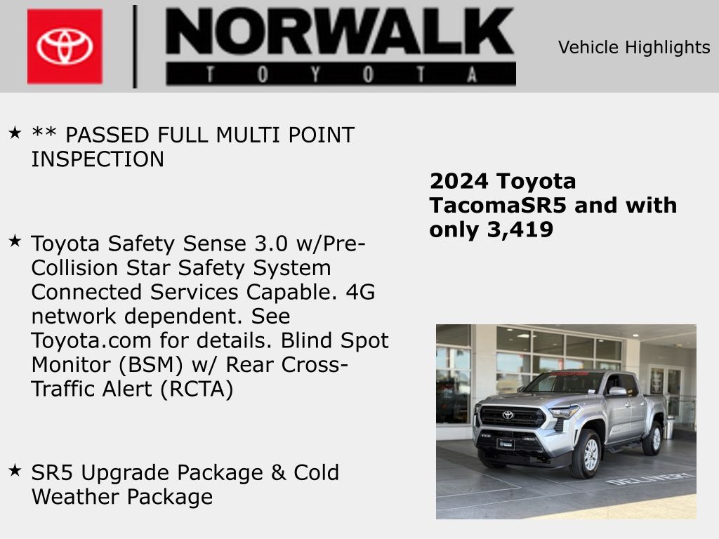 ** PASSED FULL MULTI POINT INSPECTION, Toyota Safety Sense 3.0 w/Pre-Collision Star Safety System Connected Services Capable. 4G network dependent. See Toyota.com for details. Blind Spot Monitor (BSM) w/ Rear Cross-Traffic Alert (RCTA), 4WD, 3.583 Axle Ratio, 4-Wheel Disc Brakes, 6 Speakers, ABS brakes, Air Conditioning, All Weather Floor Liners (TMS), Alloy wheels, AM/FM radio: SiriusXM, Anti-whiplash front head restraints, Apple CarPlay/Android Auto, Auto High-beam Headlights, Auto-dimming Rear-View mirror, Automatic Climate Control, Brake assist, Bumpers: body-color, Digital Key Capability, Door Edge Guard (TMS), Driver door bin, Dual front impact airbags, Dual front side impact airbags, Electronic Stability Control, Emergency communication system: Safety Connect (1-year trial), Exterior Parking Camera Rear, Four wheel independent suspension, Front & Rear Mud Guards, Front & Rear Parking Assist w/Automatic Braking, Front anti-roll bar, Front Bucket Seats, Front Center Armrest, Front fog lights, Front reading lights, Fully automatic headlights, Heated door mirrors, Heated Front Seats, Heated Leather-Trimmed Steering Wheel, HomeLink Universal Transceiver, Illuminated entry, Integrated Trailer Brake Controller, JBL Premium Audio, Knee airbag, Leather-Trimmed Shift Knob, LED Bed Lighting, Low tire pressure warning, Occupant sensing airbag, Outside temperature display, Overhead airbag, Overhead console, Panic alarm, Passenger door bin, Phone Cables - Smart USB (TMS), Power door mirrors, Power Horizontal Rear Window, Power steering, Power windows, Predator Step (TMS), Qi-Compatible Wireless Charging, Radio: 8" Toyota Audio Multimedia, Rear step bumper, Rear Underseat Storage Compartment, Rear window defroster, Remote keyless entry, Speed control, Speed-sensing steering, Split folding rear seat, SR5 Upgrade Package & Cold Weather Package, Steering wheel mounted audio controls, Tachometer, TACOMA Stamped Easy Lower & Lift Tailgate, Telescoping steering wheel, Tilt steering wheel, Traction control, Trip computer, Variably intermittent wipers, Wheels: 17" Styled Alloy.Celestial Silver 2024 Toyota Tacoma SR5 4WD 4WD 8-Speed Automatic 2.4L 4-CylinderOdometer is 8603 miles below market average!*Vehicle may have dealer added equipment not reflected in price.
