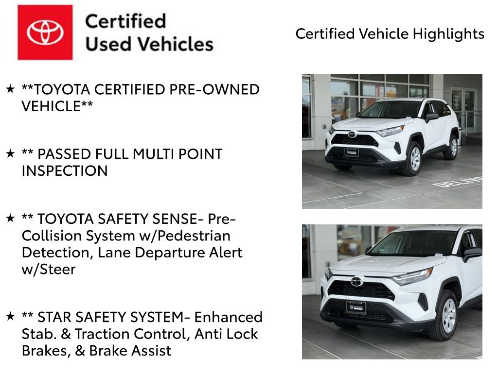 Certified. Clean CARFAX.**TOYOTA CERTIFIED PRE-OWNED VEHICLE**, ** PASSED FULL MULTI POINT INSPECTION, ** TOYOTA SAFETY SENSE- Pre-Collision System w/Pedestrian Detection, Lane Departure Alert w/Steer, ** STAR SAFETY SYSTEM- Enhanced Stab. & Traction Control, Anti Lock Brakes, & Brake Assist, AWD, Black w/Fabric Seat Trim, 17" Steel Wheels, 4-Wheel Disc Brakes, 6 Speakers, ABS brakes, Air Conditioning, All Weather Floor Liners & Cargo Liner (TMS), AM/FM radio: SiriusXM, Auto High-beam Headlights, Axle Ratio: 3.177, Brake assist, Bumpers: body-color, Driver door bin, Driver vanity mirror, Dual front impact airbags, Dual front side impact airbags, Electronic Stability Control, Emergency communication system: Safety Connect (10-year trial), Exterior Parking Camera Rear, Fabric Seat Trim, Four wheel independent suspension, Front anti-roll bar, Front Bucket Seats, Front Center Armrest, Front reading lights, Illuminated entry, Knee airbag, Low tire pressure warning, Occupant sensing airbag, Outside temperature display, Overhead airbag, Overhead console, Panic alarm, Passenger door bin, Passenger vanity mirror, Power door mirrors, Power steering, Power windows, Radio data system, Radio: AM/FM/XM Audio System, Rear anti-roll bar, Rear seat center armrest, Rear window defroster, Rear window wiper, Remote keyless entry, Speed control, Speed-sensing steering, Split folding rear seat, Spoiler, Steering wheel mounted audio controls, Tachometer, Telescoping steering wheel, Tilt steering wheel, Traction control, Trip computer.Ice Cap 2024 Toyota RAV4 LE AWD AWD 8-Speed Automatic 2.5L 4-Cylinder DOHC Dual VVT-iOdometer is 2625 miles below market average! 27/34 City/Highway MPGToyota Gold Certified Details: * Powertrain Limited Warranty: 84 Month/100,000 Mile (whichever comes first) from TCUV purchase date * 160 Point Inspection * Roadside Assistance * Limited Warranty: 12 Month/12,000 Mile Limited Comprehensive Warranty: 12 Month/12,000 Mile (whichever comes first) from certified purchase date * Roadside Assistance for 7 Year / 100,000 Mile. Standard New-Car Financing Rates Available. Warranty honored at over 1,400 Toyota dealers in the continental U.S. & Canada. Trade-ins accepted. Trouble-free handling of your transaction, including DMV paperwork * Transferable Warranty * Vehicle History * Warranty Deductible: $0*Vehicle may have dealer added equipment not reflected in price.