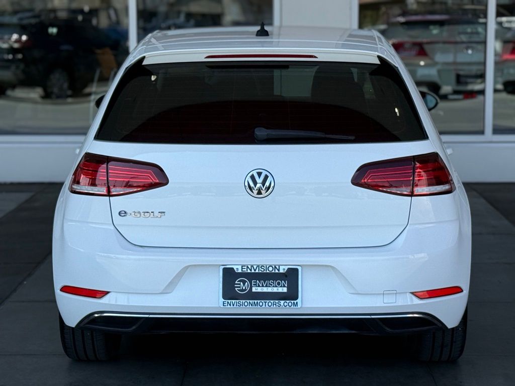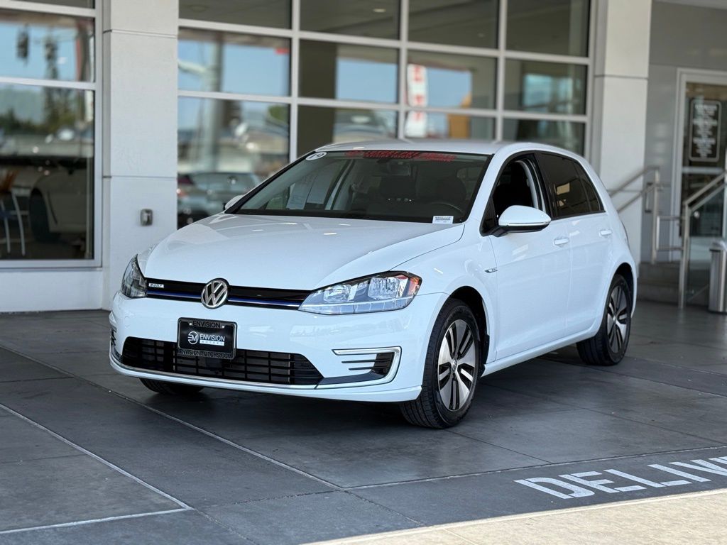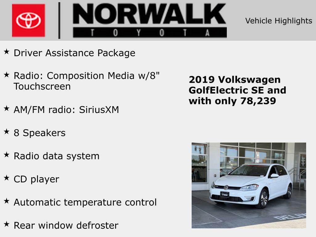 4-Wheel Disc Brakes, 8 Speakers, ABS brakes, Adaptive Cruise Control (ACC) w/Stop & Go, Air Conditioning, Alloy wheels, AM/FM radio: SiriusXM, Anti-whiplash front head restraints, Automatic temperature control, Blind Spot Monitor w/Rear Traffic Alert, Brake assist, Bumpers: body-color, CD player, Cloth Seating Surfaces, Delay-off headlights, Driver Assistance Package, Driver door bin, Driver vanity mirror, Dual front impact airbags, Dual front side impact airbags, Electronic Stability Control, Emergency communication system: VW Car-Net services (capabilities require enrollment or subscription), Exterior Parking Camera Rear, First Aid Kit, Forward Collision Warning & AEB (Front Assist), Four wheel independent suspension, Front anti-roll bar, Front Bucket Seats, Front Center Armrest, Front dual zone A/C, Front reading lights, Fully automatic headlights, Heated Comfort Front Seats, Heated door mirrors, Heated front seats, Illuminated entry, Leather Shift Knob, Leather steering wheel, Low tire pressure warning, Luggage Net, Occupant sensing airbag, Outside temperature display, Overhead airbag, Overhead console, Panic alarm, Passenger door bin, Passenger vanity mirror, Power door mirrors, Power driver seat, Power passenger seat, Power steering, Power windows, Radio data system, Radio: Composition Media w/8" Touchscreen, Rain sensing wipers, Rear anti-roll bar, Rear reading lights, Rear seat center armrest, Rear window defroster, Rear window wiper, Remote keyless entry, Security system, Speed control, Speed-sensing steering, Speed-Sensitive Wipers, Split folding rear seat, Spoiler, Steering wheel mounted audio controls, Telescoping steering wheel, Tilt steering wheel, Traction control, Trip computer, Turn signal indicator mirrors, Variably intermittent wipers, Wheels: 16" Split 5-Spoke Diamond-Turned.Pure White 2019 Volkswagen e-Golf SE FWD Single-Speed Automatic Electric Motor126/111 City/Highway MPG*Vehicle may have dealer added equipment not reflected in price.