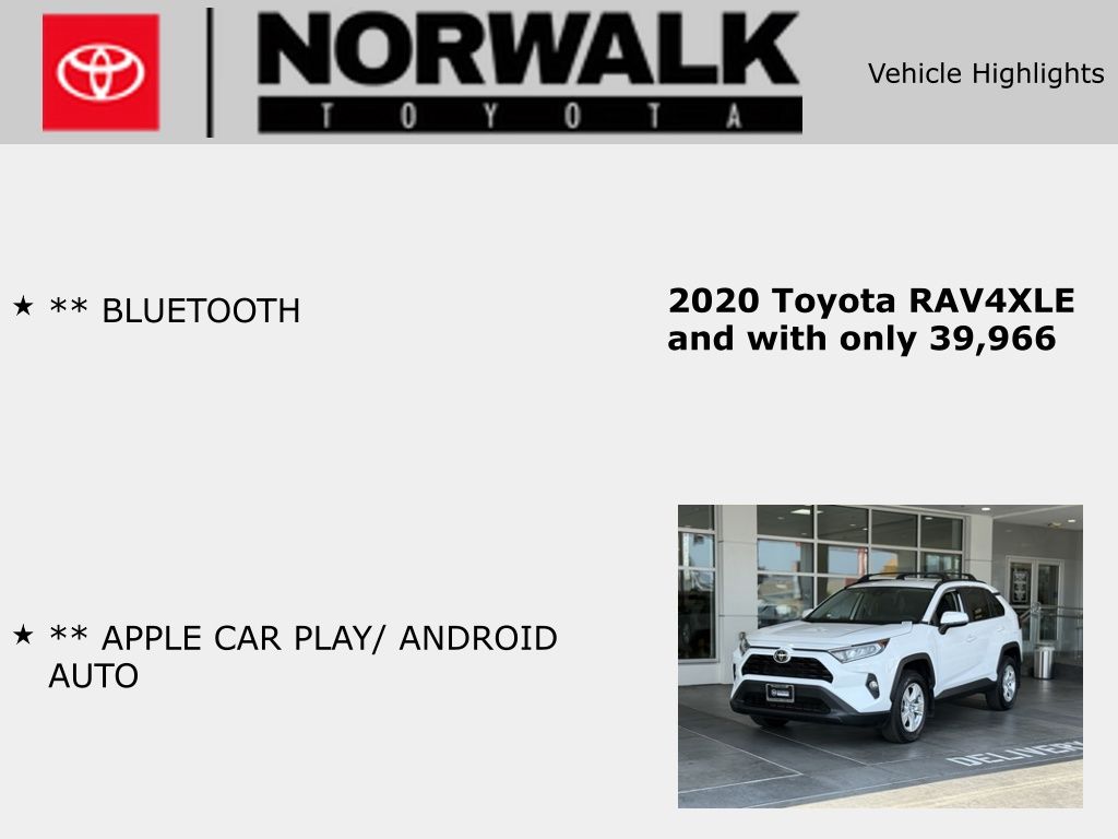 ** BLUETOOTH, ** APPLE CAR PLAY/ ANDROID AUTO, Toyota Safety Sense 2.0: Pre-Collision Sys w/ Pedestrian Detection, Full-Speed Range Dynamic Radar Cruise Control, Lane Departure Alert w/ Steering Assist, Lane Tracing Assist, Automatic High Beams, Road Sign Assist STAR Safety System: VSC, TRAC, ABS, Elect Brake-Force Distribution, Brake Assist & Smart Stop Technology Backup Camera 8 Airbags LATCH-Lower Anchor & Tether for CHildren Blind Spot Monitor w/ Rear Cross-Traffic Alert, Black w/Fabric Seat Trim, 4-Wheel Disc Brakes, 6 Speakers, ABS brakes, Air Conditioning, Alloy wheels, AM/FM radio: SiriusXM, AM/FM Stereo, Apple CarPlay/Android Auto, Auto High-beam Headlights, Automatic temperature control, Axle Ratio: 3.177, Brake assist, Bumpers: body-color, Carpet Cargo Mat, Carpet Floor Mats, Carpet Mat Package, Delay-off headlights, Door Edge Guards, Driver door bin, Driver vanity mirror, Dual front impact airbags, Dual front side impact airbags, Electronic Stability Control, Emergency communication system: Entune Safety Connect, Exterior Parking Camera Rear, Fabric Seat Trim, Four wheel independent suspension, Front anti-roll bar, Front Bucket Seats, Front Center Armrest, Front dual zone A/C, Front fog lights, Front reading lights, Fully automatic headlights, Heated door mirrors, Illuminated entry, Knee airbag, Low tire pressure warning, Mudguards, Occupant sensing airbag, Outside temperature display, Overhead airbag, Overhead console, Panic alarm, Passenger door bin, Passenger vanity mirror, Power door mirrors, Power driver seat, Power steering, Power windows, Radio data system, Rear anti-roll bar, Rear seat center armrest, Rear window defroster, Rear window wiper, Remote keyless entry, Roof Rack Cross Bars, ROOF RACKS, Speed control, Speed-sensing steering, Split folding rear seat, Spoiler, Steering wheel mounted audio controls, Tachometer, Telescoping steering wheel, Tilt steering wheel, Traction control, Trip computer, Turn signal indicator mirrors, Variably intermittent wipers, Wheels: 17" 5-Spoke Silver Alloy.Super White 2020 Toyota RAV4 XLE FWD 8-Speed Automatic 2.5L 4-Cylinder DOHC Dual VVT-iOdometer is 17164 miles below market average! 28/35 City/Highway MPG*Vehicle may have dealer added equipment not reflected in price.