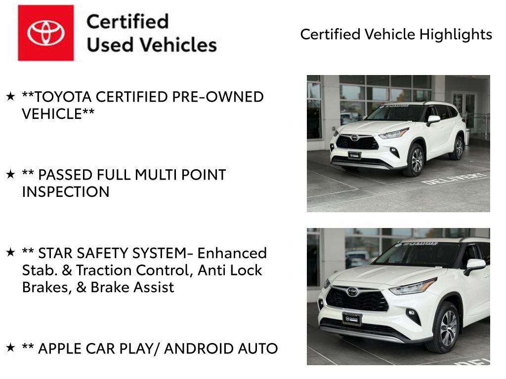 Certified. Clean CARFAX.**TOYOTA CERTIFIED PRE-OWNED VEHICLE**, ** PASSED FULL MULTI POINT INSPECTION, ** STAR SAFETY SYSTEM- Enhanced Stab. & Traction Control, Anti Lock Brakes, & Brake Assist, ** APPLE CAR PLAY/ ANDROID AUTO, Toyota Safety Sense 2.0: Pre-Collision System w/Pedestrian Detection, Full-Speed Range Dynamic Radar Cruise Control, Lane Departure Alert w/Steering Assist, Lane Tracing Assist,, 18" Machined Alloy Wheels, 2nd Row Bench Seat, 3.003 Axle Ratio, 3rd row seats: split-bench, 4-Wheel Disc Brakes, 6 Speakers, ABS brakes, Air Conditioning, All Weather Floor Liner & Cargo Tray (TMS), Alloy wheels, AM/FM radio: SiriusXM, Apple CarPlay/Android Auto, Auto High-beam Headlights, Auto-dimming Rear-View mirror, Automatic temperature control, Body Side Molding (TMS), Brake assist, Bumpers: body-color, Chrome Rear Bumper Protector, Delay-off headlights, Driver door bin, Driver vanity mirror, Dual front impact airbags, Dual front side impact airbags, Electronic Stability Control, Emergency communication system: Safety Connect with 3-year trial, Exterior Parking Camera Rear, Four wheel independent suspension, Front anti-roll bar, Front Bucket Seats, Front Center Armrest, Front dual zone A/C, Front fog lights, Front reading lights, Fully automatic headlights, Garage door transmitter: HomeLink, Heated door mirrors, Heated Front Bucket Seats, Heated front seats, Illuminated entry, Knee airbag, Leather Shift Knob, Low tire pressure warning, Mudguards (TMS), Navigation System, Occupant sensing airbag, Outside temperature display, Overhead airbag, Overhead console, Panic alarm, Passenger door bin, Passenger vanity mirror, Power door mirrors, Power driver seat, Power Liftgate, Power moonroof, Power passenger seat, Power steering, Power windows, Radio: Audio Plus (T1 Hi), Radio: Premium Audio w/Navigation, Rear air conditioning, Rear anti-roll bar, Rear reading lights, Rear window defroster, Rear window wiper, Reclining 3rd row seat, Remote keyless entry, ROOF RACKS, Security system, SofTex Seat Trim, Speed control, Speed-sensing steering, Split folding rear seat, Spoiler, Steering wheel mounted audio controls, Tachometer, Telescoping steering wheel, Tilt steering wheel, Traction control, Trip computer, Turn signal indicator mirrors, Variably intermittent wipers.Blizzard Pearl 2020 Toyota Highlander XLE FWD 8-Speed Automatic 3.5L V6 DOHC21/29 City/Highway MPGToyota Gold Certified Details: * Powertrain Limited Warranty: 84 Month/100,000 Mile (whichever comes first) from TCUV purchase date * Limited Warranty: 12 Month/12,000 Mile Limited Comprehensive Warranty: 12 Month/12,000 Mile (whichever comes first) from certified purchase date * Warranty Deductible: $0 * 160 Point Inspection * Roadside Assistance * Vehicle History * Transferable Warranty * Roadside Assistance for 7 Year / 100,000 Mile. Standard New-Car Financing Rates Available. Warranty honored at over 1,400 Toyota dealers in the continental U.S. & Canada. Trade-ins accepted. Trouble-free handling of your transaction, including DMV paperwork*Vehicle may have dealer added equipment not reflected in price.
