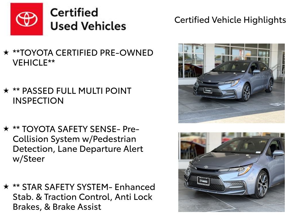 Certified.**TOYOTA CERTIFIED PRE-OWNED VEHICLE**, ** PASSED FULL MULTI POINT INSPECTION, ** TOYOTA SAFETY SENSE- Pre-Collision System w/Pedestrian Detection, Lane Departure Alert w/Steer, ** STAR SAFETY SYSTEM- Enhanced Stab. & Traction Control, Anti Lock Brakes, & Brake Assist, ** BLUETOOTH, ** APPLE CAR PLAY/ ANDROID AUTO, 18" Machined Alloy Wheels, 4-Wheel Disc Brakes, 6 Speakers, ABS brakes, Air Conditioning, Alloy wheels, AM/FM radio: SiriusXM, Apple CarPlay/Android Auto, Auto High-beam Headlights, Automatic temperature control, Brake assist, Bumpers: body-color, Delay-off headlights, Driver door bin, Driver vanity mirror, Dual front impact airbags, Dual front side impact airbags, Electronic Stability Control, Emergency communication system: Safety Connect with 1-year trial, Exterior Parking Camera Rear, Four wheel independent suspension, Front anti-roll bar, Front Bucket Seats, Front Center Armrest, Front reading lights, Front Sport Seats, Fully automatic headlights, Heated door mirrors, Knee airbag, Leather Shift Knob, Low tire pressure warning, Occupant sensing airbag, Outside temperature display, Overhead airbag, Panic alarm, Passenger door bin, Passenger vanity mirror, Power door mirrors, Power steering, Power windows, Premium Fabric Seat Trim, Radio data system, Radio: Audio, Rear anti-roll bar, Rear seat center armrest, Rear side impact airbag, Rear window defroster, Remote keyless entry, Security system, Speed control, Split folding rear seat, Spoiler, Steering wheel mounted audio controls, Tachometer, Telescoping steering wheel, Tilt steering wheel, Traction control, Trip computer, Turn signal indicator mirrors, Variably intermittent wipers.Celestite 2022 Toyota Corolla SE FWD CVT 2.0L I4 DOHC 16V31/40 City/Highway MPGToyota Gold Certified Details: * 160 Point Inspection * Vehicle History * Transferable Warranty * Roadside Assistance * Roadside Assistance for 7 Year / 100,000 Mile. Standard New-Car Financing Rates Available. Warranty honored at over 1,400 Toyota dealers in the continental U.S. & Canada. Trade-ins accepted. Trouble-free handling of your transaction, including DMV paperwork * Limited Warranty: 12 Month/12,000 Mile Limited Comprehensive Warranty: 12 Month/12,000 Mile (whichever comes first) from certified purchase date * Warranty Deductible: $0 * Powertrain Limited Warranty: 84 Month/100,000 Mile (whichever comes first) from TCUV purchase date*Vehicle may have dealer added equipment not reflected in price.