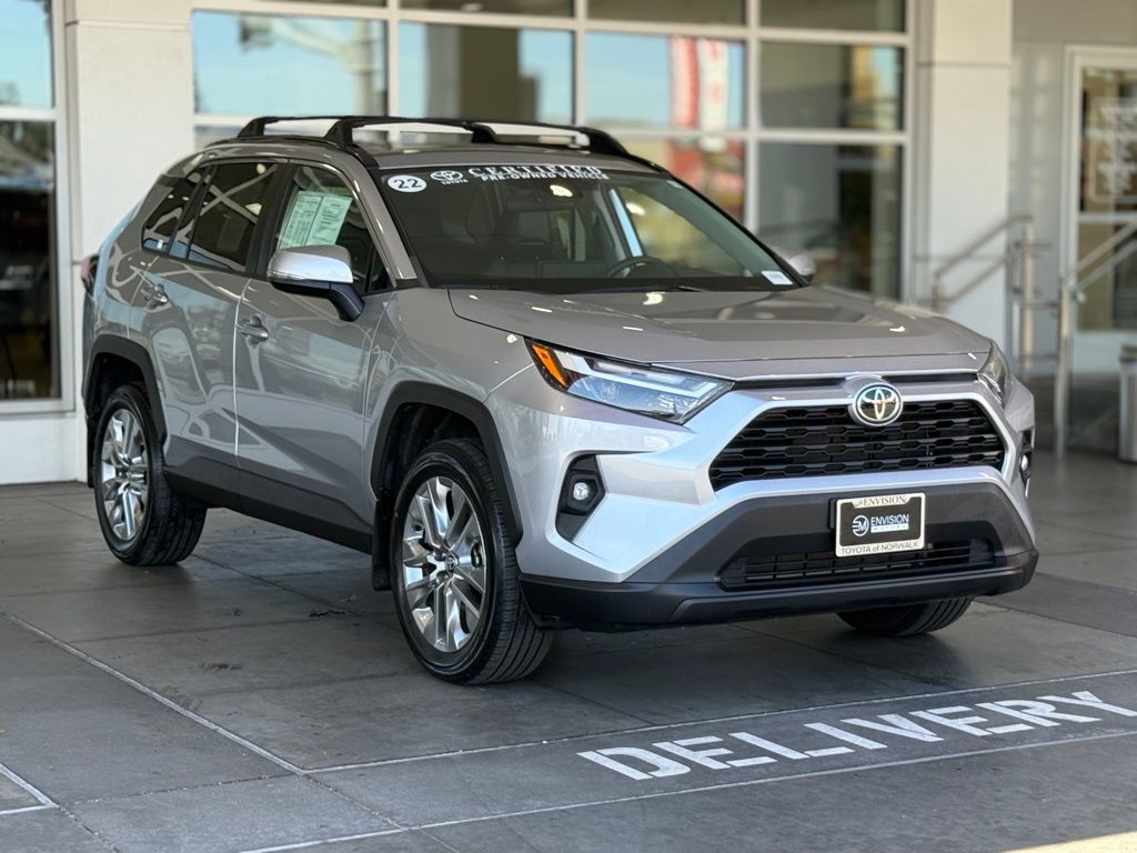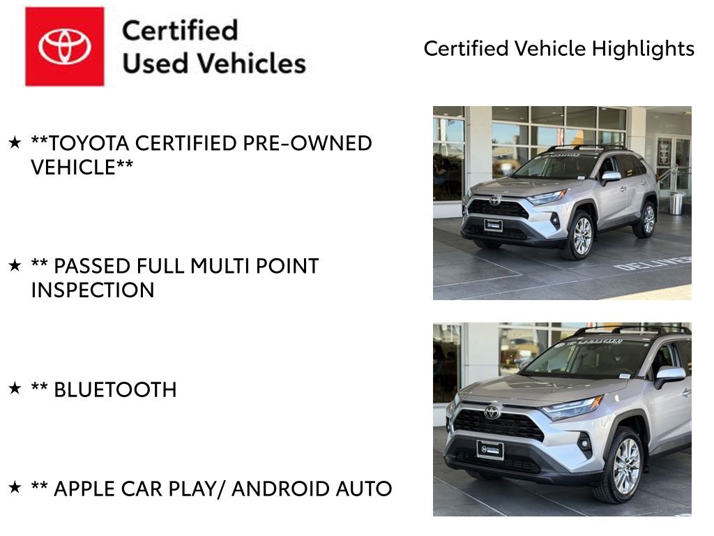 Certified.**TOYOTA CERTIFIED PRE-OWNED VEHICLE**, ** PASSED FULL MULTI POINT INSPECTION, ** BLUETOOTH, ** APPLE CAR PLAY/ ANDROID AUTO, Toyota Safety Sense 2.0: Pre-Collision Sys w/ Pedestrian Detection, Full-Speed Range Dynamic Radar Cruise Control, Lane Departure Alert w/ Steering Assist, Lane Tracing Assist, Automatic High Beams, Road Sign Assist 8 Airbags; Star Safety System Backup Camera LATCH-Lower Anchor & Tether for CHildren Blind Spot Monitor w/ Rear Cross-Traffic Alert, Black Artificial Leather, 3 Spoke Leather Steering Wheel, Convenience Package.Silver Sky 2022 Toyota RAV4 XLE Premium FWD 8-Speed Automatic 2.5L 4-Cylinder DOHC Dual VVT-iOdometer is 1853 miles below market average! 27/35 City/Highway MPGToyota Gold Certified Details: * Transferable Warranty * Limited Warranty: 12 Month/12,000 Mile Limited Comprehensive Warranty: 12 Month/12,000 Mile (whichever comes first) from certified purchase date * Warranty Deductible: $0 * 160 Point Inspection * Vehicle History * Powertrain Limited Warranty: 84 Month/100,000 Mile (whichever comes first) from TCUV purchase date * Roadside Assistance * Roadside Assistance for 7 Year / 100,000 Mile. Standard New-Car Financing Rates Available. Warranty honored at over 1,400 Toyota dealers in the continental U.S. & Canada. Trade-ins accepted. Trouble-free handling of your transaction, including DMV paperwork*Vehicle may have dealer added equipment not reflected in price.