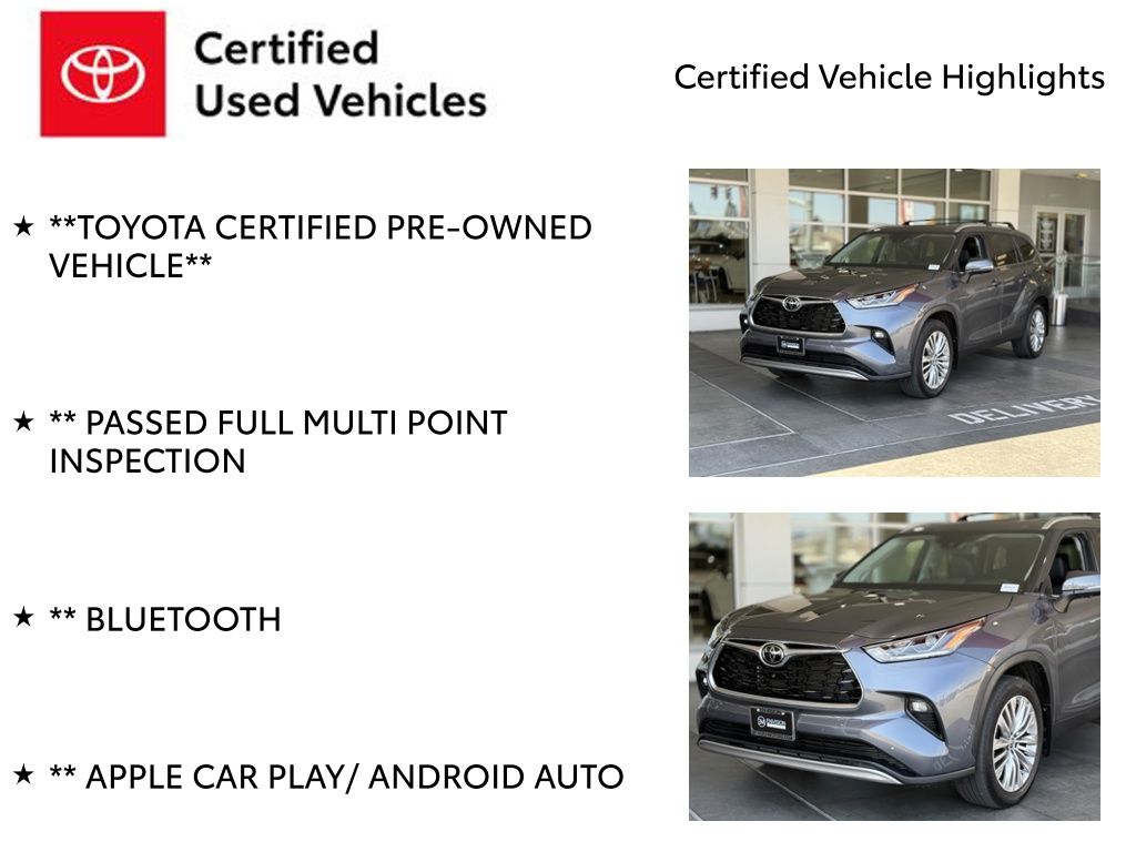 Certified.**TOYOTA CERTIFIED PRE-OWNED VEHICLE**, ** PASSED FULL MULTI POINT INSPECTION, ** BLUETOOTH, ** APPLE CAR PLAY/ ANDROID AUTO, Toyota Safety Sense 2.5+: Pre-Collision Sys w/Pedestrian Detection, Full-Speed Range Dynamic Radar Cruise Control, Lane Departure Alert w/Steering Assist, Lane Tracing Assist,, 11 Speakers, 20" Painted Alloy Wheels, 3.329 Axle Ratio, 3rd row seats: split-bench, 4-Wheel Disc Brakes, ABS brakes, Air Conditioning, All Weather Floor & Cargo Liner (TMS), Alloy wheels, AM/FM radio: SiriusXM, Auto High-beam Headlights, Auto-dimming Rear-View mirror, Automatic temperature control, Body Side Moldings (TMS), Brake assist, Bumpers: body-color, Cargo Cross Bars (TMS), Delay-off headlights, Digital Rearview Mirror, Digital Rearview Mirror w/HomeLink, Door Edge Guards (TMS), Driver door bin, Driver vanity mirror, Dual front impact airbags, Dual front side impact airbags, Electronic Inner Mirror, Electronic Stability Control, Emergency communication system: Safety Connect (up to 10-year trial subscription), Four wheel independent suspension, Front anti-roll bar, Front Bucket Seats, Front Center Armrest, Front dual zone A/C, Front fog lights, Front reading lights, Fully automatic headlights, Garage door transmitter: HomeLink, Heads-Up Display, Heated door mirrors, Heated front seats, Heated rear seats, Heated steering wheel, Heated/Ventilated Front Bucket Seats, High Grade LED Projector Headlights, Illuminated entry, Knee airbag, Leather Seat Trim, Leather Shift Knob, Leather steering wheel, Low tire pressure warning, Memory seat, Mudguards (TMS), Navigation system: Drive Connect Cloud Navigation (1-year trial subscription), Occupant sensing airbag, Outside temperature display, Overhead airbag, Overhead console, Panic alarm, Panoramic Moonroof, Panoramic View Monitor, Passenger door bin, Passenger vanity mirror, Platinum Package, Power door mirrors, Power driver seat, Power Liftgate, Power moonroof, Power passenger seat, Power steering, Power windows, Quick Charge Cables (TMS), Radio: 12.3" Toyota Audio Multimedia w/JBL Premium, Rain sensing wipers, Rear air conditioning, Rear anti-roll bar, Rear reading lights, Rear window defroster, Rear window wiper, Reclining 3rd row seat, Remote keyless entry, ROOF RACKS, Security system, Speed control, Speed-sensing steering, Split folding rear seat, Spoiler, Steering wheel mounted audio controls, Tachometer, Telescoping steering wheel, Tilt steering wheel, Traction control, Trip computer, Turn signal indicator mirrors, Variably intermittent wipers, Ventilated front seats.Magnetic Gray 2023 Toyota Highlander Platinum FWD 8-Speed Automatic 2.4L I4 PDI Turbocharged DOHC 16V LEV3-SULEV30 265hp22/29 City/Highway MPGToyota Gold Certified Details: * Vehicle History * 160 Point Inspection * Roadside Assistance * Warranty Deductible: $0 * Roadside Assistance for 7 Year / 100,000 Mile. Standard New-Car Financing Rates Available. Warranty honored at over 1,400 Toyota dealers in the continental U.S. & Canada. Trade-ins accepted. Trouble-free handling of your transaction, including DMV paperwork * Powertrain Limited Warranty: 84 Month/100,000 Mile (whichever comes first) from TCUV purchase date * Limited Warranty: 12 Month/12,000 Mile Limited Comprehensive Warranty: 12 Month/12,000 Mile (whichever comes first) from certified purchase date * Transferable Warranty*Vehicle may have dealer added equipment not reflected in price.
