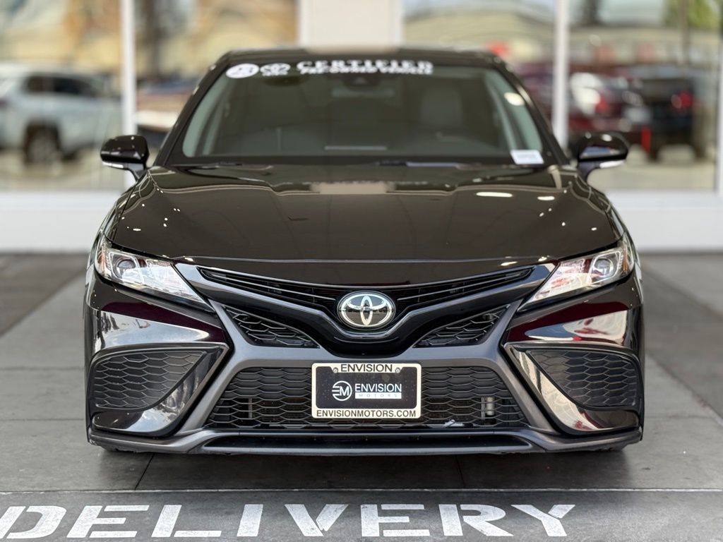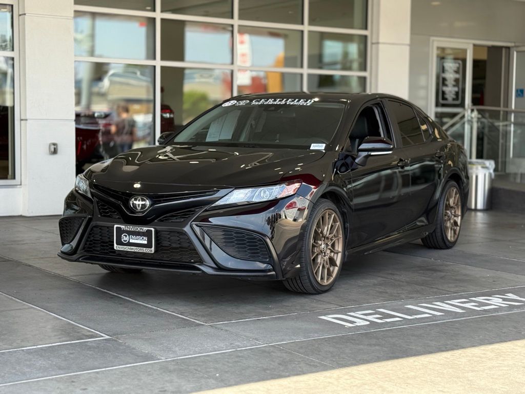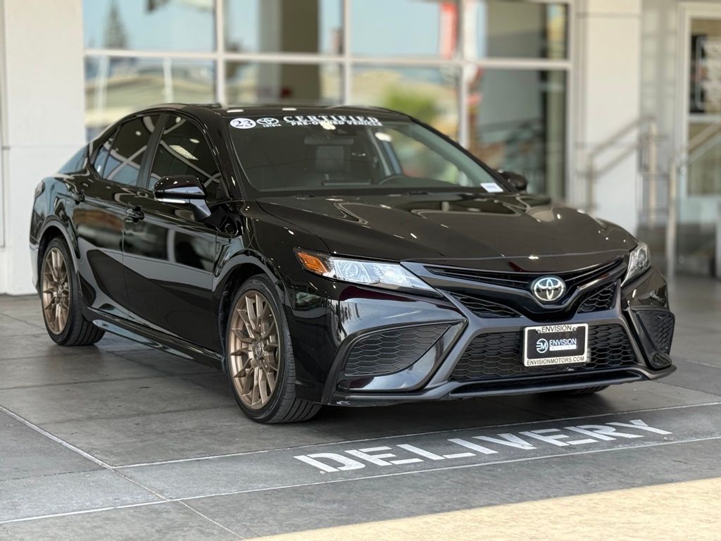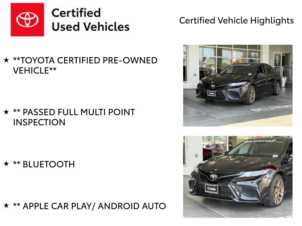 Certified. Clean CARFAX.**TOYOTA CERTIFIED PRE-OWNED VEHICLE**, ** PASSED FULL MULTI POINT INSPECTION, ** BLUETOOTH, ** APPLE CAR PLAY/ ANDROID AUTO, SAFETY & CONVENIENCE Toyota Safety Sense 2.5+: Pre-Collision Sys w/Pedestrian Detection, Dynamic Radar Cruise Control, Lane Departure Alert w/Steering Assist, Lane Tracing Assist, Automatic High Beams, Road Sign Assist Star Safety System Connected Services Capable. 4G Network Dependent., Black w/Sport SofTex Seat Trim w/Fabric Inserts, 4-Wheel Disc Brakes, 6 Speakers, ABS brakes, Air Conditioning, Alloy wheels, AM/FM radio: SiriusXM, Apple CarPlay/Android Auto, Auto High-beam Headlights, Automatic temperature control, Brake assist, Bumpers: body-color, Carpet/Trunk Mat Set (TMS), Delay-off headlights, Driver door bin, Driver vanity mirror, Dual front impact airbags, Dual front side impact airbags, Electronic Stability Control, Emergency communication system: Safety Connect (1-year trial), Exterior Parking Camera Rear, Four wheel independent suspension, Front anti-roll bar, Front Bucket Seats, Front Center Armrest, Front dual zone A/C, Front reading lights, Fully automatic headlights, Heated door mirrors, Illuminated entry, Knee airbag, Leather steering wheel, Low tire pressure warning, Nightshade Edition, Occupant sensing airbag, Outside temperature display, Overhead airbag, Overhead console, Panic alarm, Passenger door bin, Passenger vanity mirror, Power door mirrors, Power driver seat, Power steering, Power windows, Radio data system, Radio: Audio, Rear anti-roll bar, Rear seat center armrest, Rear side impact airbag, Rear window defroster, Remote keyless entry, Security system, Speed control, Speed-sensing steering, Split folding rear seat, Spoiler, Sport SofTex Seat Trim w/Fabric Inserts, Steering wheel mounted audio controls, Tachometer, Telescoping steering wheel, Tilt steering wheel, Traction control, Trip computer, Turn signal indicator mirrors, Variably intermittent wipers, Wheels: 8.5J x 19" Alloy.Midnight Black Metallic 2023 Toyota Camry SE Nightshade FWD 8-Speed Automatic 2.5L I4 DOHC 16V28/39 City/Highway MPGToyota Gold Certified Details: * Powertrain Limited Warranty: 84 Month/100,000 Mile (whichever comes first) from TCUV purchase date * Vehicle History * Roadside Assistance * Roadside Assistance for 7 Year / 100,000 Mile. Standard New-Car Financing Rates Available. Warranty honored at over 1,400 Toyota dealers in the continental U.S. & Canada. Trade-ins accepted. Trouble-free handling of your transaction, including DMV paperwork * Transferable Warranty * 160 Point Inspection * Limited Warranty: 12 Month/12,000 Mile Limited Comprehensive Warranty: 12 Month/12,000 Mile (whichever comes first) from certified purchase date * Warranty Deductible: $0*Vehicle may have dealer added equipment not reflected in price.