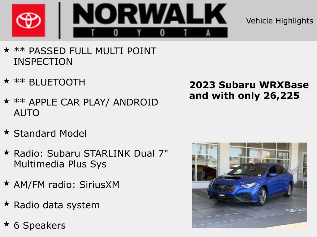 ** PASSED FULL MULTI POINT INSPECTION, ** BLUETOOTH, ** APPLE CAR PLAY/ ANDROID AUTO, 4-Wheel Disc Brakes, 6 Speakers, ABS brakes, Air Conditioning, All-Weather Floor Liners, Alloy wheels, AM/FM radio: SiriusXM, Auto High-beam Headlights, Auto-dimming Rear-View mirror, Automatic temperature control, Brake assist, Bumpers: body-color, Cargo Tray, Cloth Upholstery w/Red Stitching, Driver door bin, Driver vanity mirror, Dual front impact airbags, Dual front side impact airbags, Electronic Stability Control, Exterior Parking Camera Rear, Four wheel independent suspension, Front anti-roll bar, Front Bucket Seats, Front Center Armrest, Front reading lights, Fully automatic headlights, Illuminated entry, Knee airbag, Leather Shift Knob, Leather steering wheel, Low tire pressure warning, Occupant sensing airbag, Outside temperature display, Overhead airbag, Overhead console, Panic alarm, Passenger door bin, Passenger vanity mirror, Performance Design Front Bucket Seats, Power door mirrors, Power steering, Power windows, Radio data system, Radio: Subaru STARLINK Dual 7" Multimedia Plus Sys, Rear anti-roll bar, Rear Seatback Protector, Rear window defroster, Remote keyless entry, Security system, Speed control, Speed-sensing steering, Split folding rear seat, Sport steering wheel, Standard Model, STARLINK/Apple CarPlay/Android Auto, Steering wheel mounted audio controls, Sunshade - Windshield, Tachometer, Telescoping steering wheel, Tilt steering wheel, Traction control, Trip computer, Trunk Cargo Hooks, Variably intermittent wipers, Wheels: 17" x 8" Gray Finish Aluminum Alloy.WR Blue Pearl 2023 Subaru WRX AWD 6-Speed Manual 2.4L DOHC19/26 City/Highway MPG*Vehicle may have dealer added equipment not reflected in price.