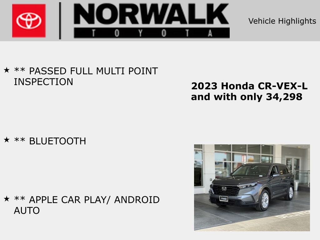 Clean CARFAX.** PASSED FULL MULTI POINT INSPECTION, ** BLUETOOTH, ** APPLE CAR PLAY/ ANDROID AUTO.Gray 2023 Honda CR-V EX-L FWD CVT 1.5L I4 DOHC 16V28/34 City/Highway MPG*Vehicle may have dealer added equipment not reflected in price.