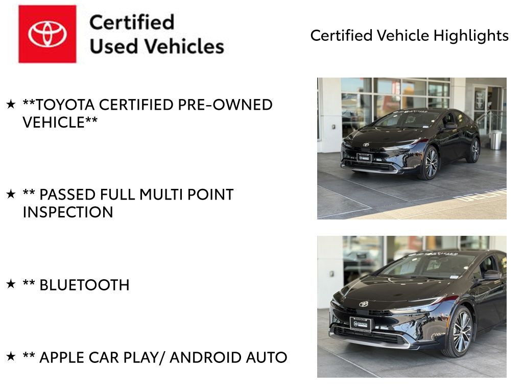 Certified.**TOYOTA CERTIFIED PRE-OWNED VEHICLE**, ** PASSED FULL MULTI POINT INSPECTION, ** BLUETOOTH, ** APPLE CAR PLAY/ ANDROID AUTO, SAFETY & CONVENIENCE Toyota Safety Sense 3.0 w/Pre-Collision Front and Rear Parking Assist w/ Automatic Braking Safe Exit Assist Blind Spot Monitor w/Rear Cross-Traffic Alert 3 Door Smart Key System w/Push Button Start Connected Services Capable. 4G network dependent. See Toyota.com for details., 2.0L 4-Cylinder DOHC 16V VVT, 19" Alloy Wheels, 4-Wheel Disc Brakes, 6 Speakers, ABS brakes, Air Conditioning, All Weather Floor Liners/Cargo Liner (TMS), Alloy wheels, AM/FM radio: SiriusXM, Auto High-beam Headlights, Auto-dimming Rear-View mirror, Automatic temperature control, Brake assist, Bumpers: body-color, Delay-off headlights, Door Edge Guards (TMS), Door Sill Protectors (TMS), Driver door bin, Driver vanity mirror, Dual front impact airbags, Dual front side impact airbags, Electronic Stability Control, Emergency communication system: Safety Connect (up to 10-year trial subscription), Exterior Parking Camera Rear, Four wheel independent suspension, Front anti-roll bar, Front Bucket Seats, Front Center Armrest, Front reading lights, Fully automatic headlights, Garage door transmitter: HomeLink, Heated door mirrors, Heated front seats, Heated Sport Front Bucket Seats, Heated steering wheel, Illuminated entry, Low tire pressure warning, Mudguards (TMS), Occupant sensing airbag, Outside temperature display, Overhead airbag, Overhead console, Panic alarm, Panoramic Fixed Glass Roof, Passenger door bin, Passenger vanity mirror, Power door mirrors, Power driver seat, Power steering, Power windows, Quick Charge Cable (TMS), Radio data system, Radio: 12.3" Toyota Audio Multimedia System, Radio: Audio System, Rain sensing wipers, Rear anti-roll bar, Rear Bumper Applique (TMS), Rear reading lights, Rear seat center armrest, Rear side impact airbag, Rear window defroster, Remote keyless entry, SofTex Seat Trim, Speed control, Speed-Sensitive Wipers, Split folding rear seat, Steering wheel mounted audio controls, Telescoping steering wheel, Tilt steering wheel, Traction control, Trip computer, Variably intermittent wipers, Wireless Digital Key w/Smart Door Lock.Midnight Black 2024 Toyota Prius XLE FWD Continuously Variable (ECVT) 2.0L 4-Cylinder DOHC 16V VVTOdometer is 7314 miles below market average! 52/52 City/Highway MPGToyota Gold Certified Details: * Roadside Assistance for 7 Year / 100,000 Mile. Standard New-Car Financing Rates Available. Warranty honored at over 1,400 Toyota dealers in the continental U.S. & Canada. Trade-ins accepted. Trouble-free handling of your transaction, including DMV paperwork * Transferable Warranty * 160 Point Inspection * Limited Warranty: 12 Month/12,000 Mile Limited Comprehensive Warranty: 12 Month/12,000 Mile (whichever comes first) from certified purchase date * Vehicle History * Roadside Assistance * Powertrain Limited Warranty: 84 Month/100,000 Mile (whichever comes first) from TCUV purchase date * Warranty Deductible: $0*Vehicle may have dealer added equipment not reflected in price.