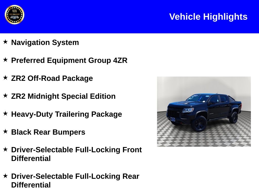 Experience unbeatable deals and top-tier service at Theodore Robins Ford—your trusted family-owned dealership since 1921!2021 Chevrolet Colorado ZR2 Black 4WD V6 8-Speed AutomaticCertified. CARFAX One-Owner. Black Rear Bumpers, Black Spray-On Bedliner w/Chevrolet Logo, Driver-Selectable Full-Locking Front Differential, Driver-Selectable Full-Locking Rear Differential, Heavy-Duty Trailering Package, Hitch Guidance, Integrated Trailer Brake Controller, Navigation System, Off-Road Lights (LPO), Off-Road Sport Bar (LPO) (SCU), Preferred Equipment Group 4ZR, Tow/Haul Mode, Wheels: 17" x 8" Gloss Black Aluminum, ZR2 Midnight Special Edition, ZR2 Off-Road Package.Certification Program Details: Ford Blue Advantage Ford Blue Certified Details: - 3-Month/4,000-Mile* Comprehensive Limited Warranty coverage - 139-point Vehicle Inspection - Warranty Deductible: $100 per repair visit - 24-Hour Roadside Assistance - FordPass Rewards Points (Can be used toward scheduled maintenance**) - Transferable Warranty *Whichever comes first **Ask dealer for details