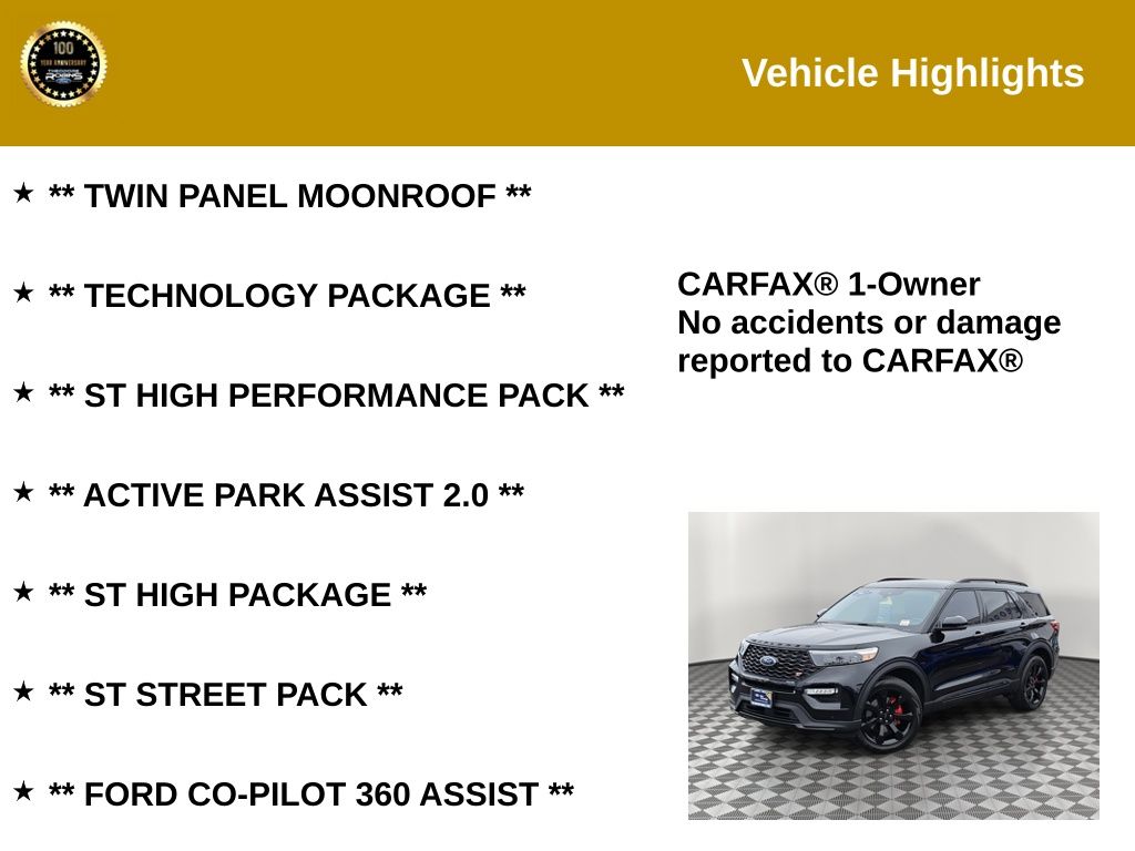 Experience unbeatable deals and top-tier service at Theodore Robins Ford—your trusted family-owned dealership since 1921!2023 Ford Explorer ST Agate Black Metallic 4WD 3.0L EcoBoost V6 10-Speed AutomaticCertified. CARFAX One-Owner. Clean CARFAX. ** TWIN PANEL MOONROOF **, ** TECHNOLOGY PACKAGE **, ** ST HIGH PERFORMANCE PACK **, ** ACTIVE PARK ASSIST 2.0 **, ** ST HIGH PACKAGE **, ** ST STREET PACK **, ** FORD CO-PILOT 360 ASSIST **.Ford Gold Certified Details: * 172 Point Inspection * Vehicle History * Powertrain Limited Warranty: 84 Month/100,000 Mile (whichever comes first) from original in-service date * Limited Warranty: 12 Month/12,000 Mile (whichever comes first) after new car warranty expires or from certified purchase date * Transferable Warranty * and 22,000 FordPass Rewards Points to use toward first two maintenance visits * Warranty Deductible: $100 * Roadside Assistance