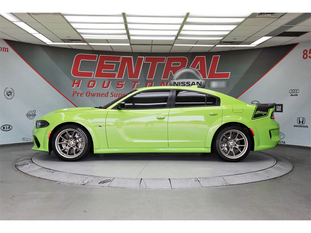 Central Houston Nissan is proud to present you with another True Market Priced Pre-Owned Vehicle. This 2023 Dodge Charger R/T Scat Pack Widebody is loaded with the following Factory Options: Black Cloth Navigation & Travel Group (1-Yr SiriusXM Guardian Trial, 2-Piece Shark Fin Antenna, 4G LTE Wi-Fi Hot Spot, 5-Year SiriusXM Traffic Service, 5-Year SiriusXM Travel Link Service, 8.4" Touchscreen Display, Apple CarPlay, Compass Gauge, For Details, Visit DriveUconnect.com, Google Android Auto, GPS Antenna Input, GPS Navigation, HD Radio, Integrated Center Stack Radio, Integrated Voice Command w/Bluetooth, Media Hub (2 USB, AUX), Radio: Uconnect 4C Nav w/8.4" Display, SiriusXM Traffic Plus, SiriusXM Travel Link, and USB Host Flip), Plus Group (Auto Adjust In Reverse Exterior Mirrors, Auto-Dimming Exterior Driver Mirror, Black-Edged Premium Floormats, Blind Spot & Cross Path Detection, Blind Spot Memory/Power/Heat Mirror, Driver & Passenger Lower LED Lamps, Exterior Mirrors Courtesy Lamps, Exterior Mirrors w/Heating Element, Front Overhead LED Lighting, Heated Front Seats, Power 2-Way Driver Lumbar Adjust, Power 2-Way Passenger Lumbar Adjust, Power Front Driver/Passenger Seats, Power Tilt/Telescope Steering Column, Premium-Stitched Dash Panel, Radio/Driver Seat/Mirrors Memory, Rear Armrest w/Cupholder Seat, Scat Pack Logo Nappa/Alcantara Seat, and Ventilated Front Seats), Quick Order Package 21V Scat Pack Widebody (All Speed Traction Control, Body Color Fender Flares, Brembo 6-Pot Fixed Front Caliper Brakes, Flat-Bottom Steering Wheel, Performance Shift Indicator, Wheels: 20" x 11" Carbon Black Aluminum, and Widebody Competition Suspension), Swinger Special Edition (Aluminum Interior Bezel w/Wood Look, Basil Green IP/Console/Door Stitching, Gold School Bee Fender Badge, Gold School Scat Pack/Bee Decklid Badge, Gold School Scat Pack/Bee Grille Badge, Nappa Alcantara Seat Trim w/Green Stitch, Rhombi 2-Pc Wheel Center Cap, Satin Black Dodge Tail Lamp Badge, Swinger Exterior Vinyl Graphics, Unique IP Badge, and Wheels: 20" x 11.0" Gold School), Technology Group (Adaptive Cruise Control w/Stop, Advanced Brake Assist, Auto High Beam Headlamp Control, Full Speed FWD Collision Warn Plus, Lane Departure Warning Plus, and Rain Sensitive Windshield Wipers), Widebody Package, Black Cloth, 4-Wheel Disc Brakes, 6 Speakers, ABS brakes, Adaptive Damping Suspension (DISC), Air Conditioning, Alloy wheels, AM/FM radio: SiriusXM, Anti-whiplash front head restraints, Apple CarPlay/Android Auto, Auto-dimming Rear-View mirror, Automatic temperature control, Brake assist, Bumpers: body-color, Cloth Performance Seats w/Heat, Compass, Delay-off headlights, Driver door bin, Driver vanity mirror, Dual front impact airbags, Dual front side impact airbags, Electronic Stability Control, Emergency communication system: SiriusXM Guardian, Four wheel independent suspension, Front anti-roll bar, Front Bucket Seats, Front Center Armrest, Front dual zone A/C, Front fog lights, Front reading lights, Fully automatic headlights, Garage door transmitter: HomeLink, Heated door mirrors, Heated front seats, Heated steering wheel, Illuminated entry, Knee airbag, Leather Shift Knob, Low tire pressure warning, Occupant sensing airbag, Outside temperature display, Overhead airbag, Overhead console, Panic alarm, ParkView Rear Back-Up Camera, Passenger door bin, Passenger vanity mirror, Power door mirrors, Power driver seat, Power steering, Power windows, Radio: Uconnect 4C w/8.4" Display, Rear anti-roll bar, Rear reading lights, Rear seat center armrest, Rear window defroster, Remote keyless entry, Security system, Speed control, Speed-Sensitive Wipers, Split folding rear seat, Spoiler, Sport steering wheel, Steering wheel mounted audio controls, Tachometer, Telescoping steering wheel, Tilt steering wheel, Traction control, Trip computer, Variably intermittent wipers, and Wheels: 20" x 9" Lo Gloss Granite Crystal!!Central Houston Nissan is more than just your typical car dealer