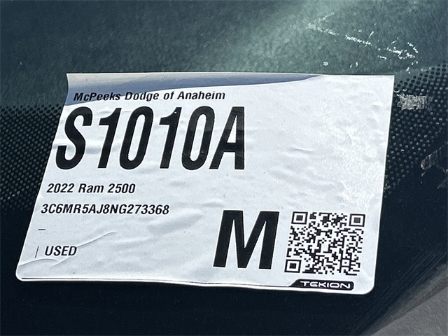Certified. Clean CARFAX. CARFAX One-Owner. INTERIOR & EXTERIOR PROFESSIONALLY DETAILED FOR DELIVERY, MCPEEK CHRYSLER DODGE JEEP RAM FAMILY OWNED AND OPERATED SINCE 1961 !!!!!.Bright White Clearcoat 2022 Ram 2500 Tradesman 4WD 8-Speed AutomaticFCA US LLC Certified Pre-Owned Details: * Vehicles Up to 75,000 Miles and/or 5 Model Years. 24-Hour Towing & Roadside Assistance, Car Rental Allowance, CARFAX® Vehicle History ReportTM and an Introductory 3-month Subscription to SiriusXM® Satellite Radio & Certified Warranty Upgrades * Transferable Warranty * Limited Warranty: 3 Month/3,000 Mile (whichever comes first) after new car warranty expires or from certified purchase date * Warranty Deductible: $100 * Roadside Assistance * Vehicle History * 125 Point Inspection * Powertrain Limited Warranty: 84 Month/100,000 Mile (whichever comes first) from original in-service dateReceive Free lube and oil filter changes for up to 45,000 miles for 3 years!!! McPeek's Dodge of Anahiem 1221 S. Auto Center Drive Anahiem, CA 92806 714-262-4902.