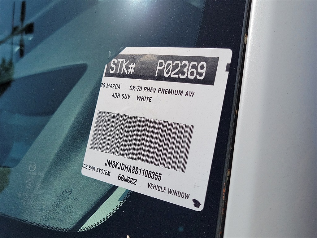 **All of our pre-owned vehicles are priced regularly using the most advanced REAL-TIME MARKET PRICING TECHNOLOGY available to ensure the price you’re offered is the best possible value. Please be mindful, our vehicles are VALUE-PRICED and tend to sell very quickly. If you see something you love, don’t wait, since it’s possible that many other potential customers share your enthusiasm** We offer this Mazda CX-70 PHEV with the following added value options: CERTIFIED, CX-70 PHEV Premium, AWD, Rhodium White Premium. Priced below KBB Fair Purchase Price!CARFAX One-Owner. Clean CARFAX. Certified.Odometer is 3001 miles below market average!Mazda Certified Pre-Owned Details: * 160 Point Inspection * Includes Autocheck Vehicle History Report with 3 Year Buyback Protection. 3 month SiriusXM trial subscription. * Powertrain Limited Warranty: 84 Month/100,000 Mile (whichever comes first) from original in-service date * Warranty Deductible: $0 * Vehicle History * Roadside Assistance * Transferable Warranty * Limited Warranty: 12 Month/12,000 Mile (whichever comes first) after new car warranty expires or from certified purchase dateSubject to prior sale. Although every reasonable effort has been made to ensure the accuracy of the information contained on this site, absolute accuracy cannot be guaranteed. Not responsible for typographical errors. Prices do not include government fees, taxes, title, finance charges, document fee, or emission testing charge. NOTICE: All our vehicles have an anti-theft Rockledge Alarm system installed. This advertised price excludes the purchase price of the anti-theft system, which can be purchased for an additional cost or deactivated from the vehicle at the time of sale.