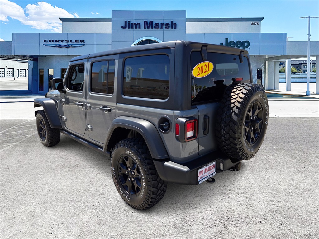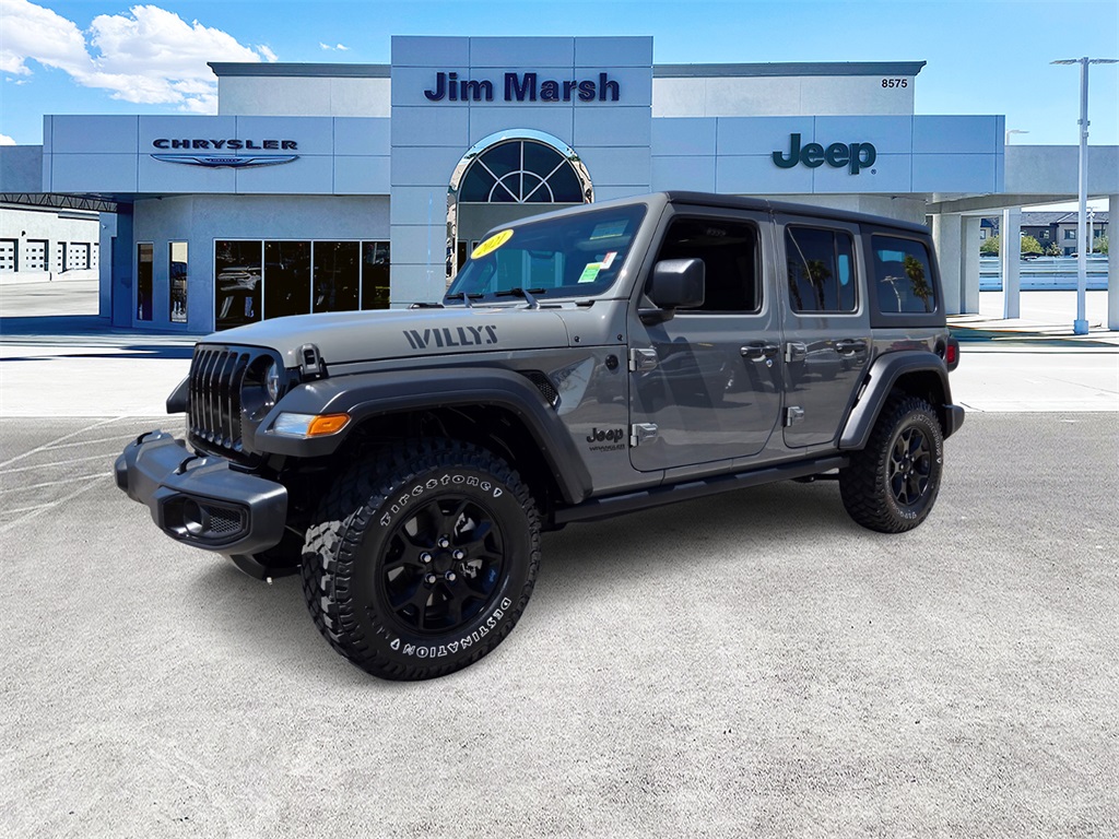 Sting-Gray Clearcoat 2021 Jeep Wrangler Unlimited Willys 4WD 6-Speed Manual 3.6L V6 24V VVTRecent Arrival!Call 844-538-1681 today to schedule your test drive! *Market Value: It does not include any taxes, fees or other charges. Due to 3rd party feed, the sales price and MSRP may differ, please contact dealer for details. * Pricing provided may vary significantly between website and dealer as a result of supply chain constraints. Pricing shown is non-binding and does not constitute an offer. Contact your dealer for updated vehicle pricing. * The estimated selling price that appears after calculating dealer offers is for informational purposes, only. Dealer pricing plus reconditioning fees on all preowned vehicles. You may not qualify for the offers, incentives, discounts, or financing. Offers, incentives, discounts, or financing are subject to expiration and other restrictions. See dealer for qualifications and complete details. * Images, prices, and options shown, including vehicle color, trim, options, pricing and other specifications are subject to availability, incentive offerings, current pricing and credit worthiness. * In transit means that vehicles have been built, but have not yet arrived at your dealer. Images shown may not necessarily represent identical vehicles in transit to your dealership. See your dealer for actual price, payments and complete details. Discounts and Rebates only apply to Nevada residents.