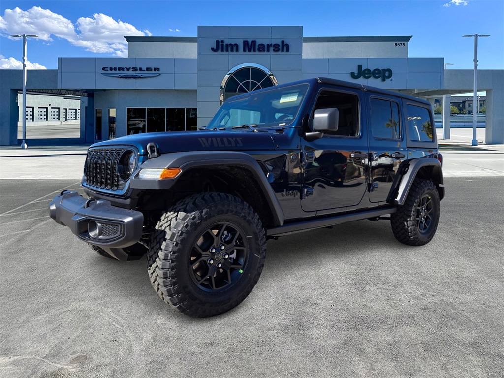 First year's maintenance included with purchase of every new Chrysler or Jeep vehicle! This 2025 Fathom Blue Pearlcoat Jeep Wrangler Willys 4WD is well equipped and includes these features and benefits: Quick Order Package 22W Willys (4-Wheel Drive Swing Gate Decal, 4.10 Rear Axle Ratio, 7 & 4 Pin Wiring Harness, 97 MPH Vehicle Max Speed Calibration, Advanced Brake Assist, Automatic Headlamps, Auxiliary Switches, Black Grille, Class II Receiver Hitch, Conventional Differential Front Axle, Corning Gorilla Glass, Dana M210 Wide HD Tube Front Axle, Dana M220 Wide Rear Axle, Daytime Running Lamps LED Accents, Deep Tint Sunscreen Windows, E-Locker Rear Axle, Enhanced Adaptive Cruise Control, Front LED Fog Lamps, Full Speed Forward Collision Warning Plus, Injection Molded Black Rear Bumper, LED Premium Reflector Headlamps, Mold In Color Bumper w/Gloss Black, Molded in Color Rubicon Highline Flare, MOPAR All-Weather Floor Mats, Off-Road Plus Mode, Power Heated Mirrors, Premium Wrapped Steering Wheel, Security Alarm, Sun Visors w/Illuminated Vanity Mirrors, Wheels: 17" x 7.5" Painted Black, Willy's Suspension, and Willys Hood Decal), 110 MPH Vehicle Max Speed Calibration, 3.45 Overall Top Gear Ratio, 4-Wheel Disc Brakes, 8 Speakers, ABS brakes, Air Conditioning, AM/FM radio: SiriusXM, Apple CarPlay/Android Auto, Aux Battery, Black 3-Piece Hard Top, Brake assist, Cloth Low-Back Bucket Seats, Compass, Delay-off headlights, Driver door bin, Driver vanity mirror, Dual front impact airbags, Dual front side impact airbags, Electronic Stability Control, Freedom Panel Storage Bag, Front anti-roll bar, Front Bucket Seats, Front Center Armrest w/Storage, Front fog lights, Front reading lights, Illuminated entry, Integrated roll-over protection, Low tire pressure warning, Non-Lock Fuel Cap w/o Discriminator, Normal Duty Suspension, Occupant sensing airbag, Outside temperature display, Overhead airbag, Panic alarm, ParkView Rear Back-Up Camera, Passenger door bin, Passenger vanity mirror, Power steering, Power windows, Radio data system, Radio: Uconnect 5 w/12.3" Display, Rear anti-roll bar, Rear reading lights, Rear Window Defroster, Rear Window Wiper/Washer, Remote keyless entry, Speed control, Split folding rear seat, Steering wheel mounted audio controls, Stop-Start Dual Battery System, Tachometer, Telescoping steering wheel, Tilt steering wheel, Traction control, Trip computer, Variably intermittent wipers, and Wheels: 17" x 7.5" Black Steel Styled.Call 844-538-1681 today to schedule your test drive! *MSRP is the Manufacturer's Suggested Retail Price (MSRP) of the vehicle. It does not include any taxes, fees or other charges. Due to 3rd party feed, the sales price and MSRP may differ, please contact dealer for details. * Pricing provided may vary significantly between website and dealer as a result of supply chain constraints. Pricing shown is non-binding and does not constitute an offer. Discounts and Rebates only apply to Nevada residents. Contact your dealer for updated vehicle pricing. * The estimated selling price that appears after calculating dealer offers is for informational purposes, only. Dealer pricing plus reconditioning fees on all preowned vehicles. You may not qualify for the offers, incentives, discounts, or financing. Offers, incentives, discounts, or financing are subject to expiration and other restrictions. See dealer for qualifications and complete details. * Images, prices, and options shown, including vehicle color, trim, options, pricing and other specifications are subject to availability, incentive offerings, current pricing and credit worthiness. * In transit means that vehicles have been built, but have not yet arrived at your dealer. Images shown may not necessarily represent identical vehicles in transit to your dealership. See your dealer for actual price, payments and complete details.