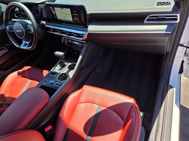 CARFAX One-Owner.Glacial White Pearl 2023 Kia K5 GT-Line AWD 8-Speed Automatic 1.6L I4 DGI Turbocharged DOHC 16V LEV3-ULEV70 180hpIf you don't drive here, you can't save here!Price may not include recon fee. GT-Line Premium Package (Forward Collision Avoidance-Assist, Highway Driving Assist, LED Projection Headlamps, and Smart Cruise Control w/Stop & Go), GT-Line Red Interior Package, 4-Wheel Disc Brakes, 6 Speakers, ABS brakes, Air Conditioning, Alloy wheels, AM/FM radio: SiriusXM, Apple CarPlay & Android Auto, Auto High-beam Headlights, Automatic temperature control, Brake assist, Bumpers: body-color, Carpeted Floor Mats, Cloth/SynTex Seat Trim, Delay-off headlights, Driver door bin, Driver vanity mirror, Dual front impact airbags, Dual front side impact airbags, Electronic Stability Control, Four wheel independent suspension, Front anti-roll bar, Front Bucket Seats, Front Center Armrest, Front dual zone A/C, Front fog lights, Front reading lights, Fully automatic headlights, Heated door mirrors, Illuminated entry, Knee airbag, Low tire pressure warning, Navigation System, Occupant sensing airbag, Outside temperature display, Overhead airbag, Overhead console, Panic alarm, Passenger door bin, Passenger vanity mirror, Power door mirrors, Power driver seat, Power steering, Power windows, Radio data system, Radio: AM/FM/MP3 Audio System, Rear anti-roll bar, Rear seat center armrest, Rear side impact airbag, Rear window defroster, Remote keyless entry, Security system, Speed control, Speed-sensing steering, Split folding rear seat, Spoiler, Sport steering wheel, Steering wheel mounted audio controls, Tachometer, Telescoping steering wheel, Tilt steering wheel, Traction control, Trip computer, Turn signal indicator mirrors, Variably intermittent wipers, and Wheels: 18" Gloss Black Machined Finish Alloy.