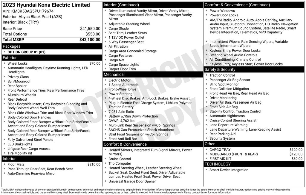Abyss Black Pearl 2023 Hyundai Kona Electric Limited FWD 1-Speed Automatic Electric Motor 17" Unique Alloy Wheels, 8 Speakers, harman/kardon® Speakers, Heated & Ventilated Front Bucket Seats, Heated front seats, Leather Seat Trim, Navigation System, Option Group 01, Power driver seat, Power moonroof, Radio: AM/FM/HD Radio/SiriusXM Audio System.134/106 City/Highway MPG