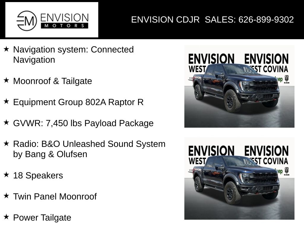 WE SPECIALIZE IN ALL CREDIT PROFILES! See what we can do for you! Call to find out (626) 899-9302.4WD, 17" Forged Aluminum Bead-Lock Capable Wheels, 18 Speakers, Black Exterior Accents, Carbon Fiber Interior Appliques, Code Orange Stitching Doors & Instrument Panel, Code Orange Tow Hooks, Equipment Group 802A Raptor R, GVWR: 7,450 lbs Payload Package, Interior Code Orange Raptor R Badging, Moonroof & Tailgate, Navigation system: Connected Navigation, Partitioned Lockable Fold-Flat Storage, Power Tailgate, Radio: B&O Unleashed Sound System by Bang & Olufsen, Raptor R Badge Tailgate Applique, Raptor R Exterior Graphics, Recaro Black w/Orange Stitching Front Seats, SYNC 4 w/Enhanced Voice Recognition, Twin Panel Moonroof, Unique Hood Vent w/R Badge, Unique Raptor R Grille w/R Badge, Wheels: Unique 17" Forged Aluminum Bead-Lock Capable.Antimatter Blue Metallic2023 Ford F-150 Raptor 4WD 10-Speed Automatic 5.2L V8**********All Pricing and Advertised Prices for any/all vehicles offered for sale does not include dealer installed accessories which can be purchased for an additional cost.********** The Factory Rebates may not be available on this vehicle if you elect to take advantage of a Special Alternative APR or Special Lease program. Some Factory Rebates are California Resident specific and may vary for residents of other states. NO sales to Dealers, Brokers or Exporters. For out of state purchase, customers must be present to purchase. If shipping is required, dealership must facilitate; no exceptions. Please contact us for special Multi-Vehicle or Fleet pricing. Prices are plus government fees and taxes, any finance charges, $85 documentary fee, $29 electronic registration fee, any emission testing charge and $1.75 per new tire state tire fee. *** We make every effort to provide accurate information, but please verify before purchasing. Leasing & financing available on approved credit. Trade-ins accepted. Subject to prior sale.
